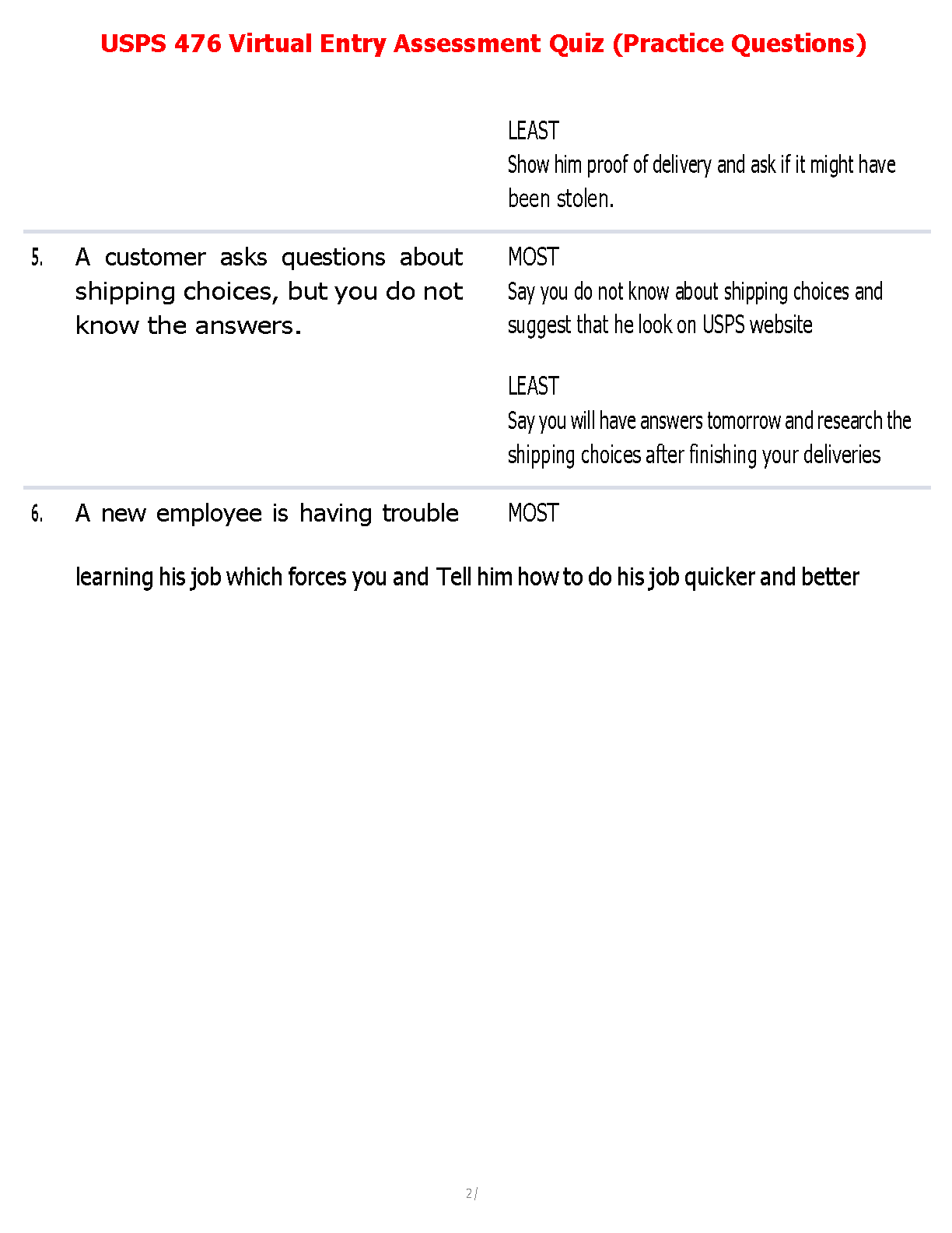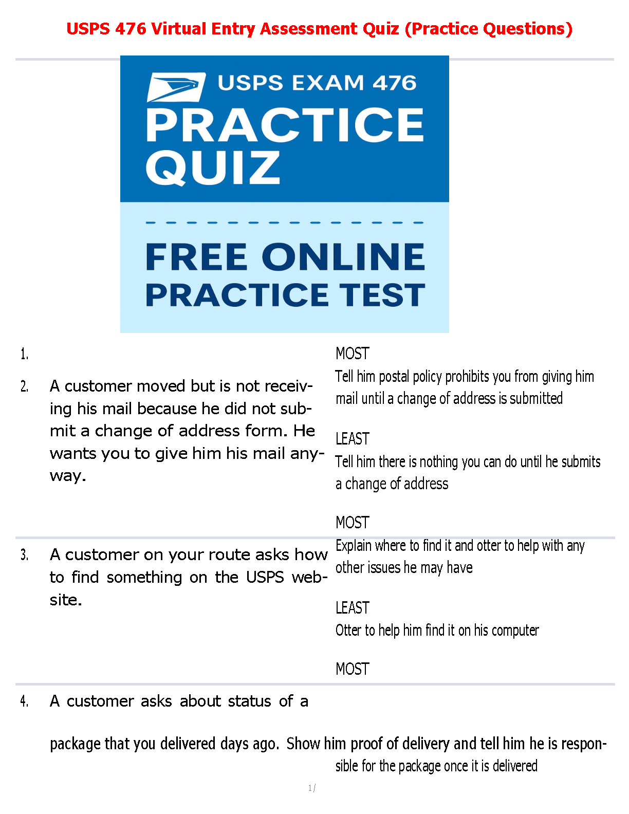 Prepare confidently for the USPS Exam 476 Virtual Entry Assessment with this comprehensive practice quiz, designed for the 2025/2026 academic year. Featuring realistic questions that mirror the actual assessment, this resource is meticulously crafted to enhance your problem-solving, customer service, and decision-making skills. Master the key competencies required for a successful postal career and ensure you pass your entry assessment on the first attempt, avoiding costly resits and fast-tracking your employment with the U.S. Postal Service.