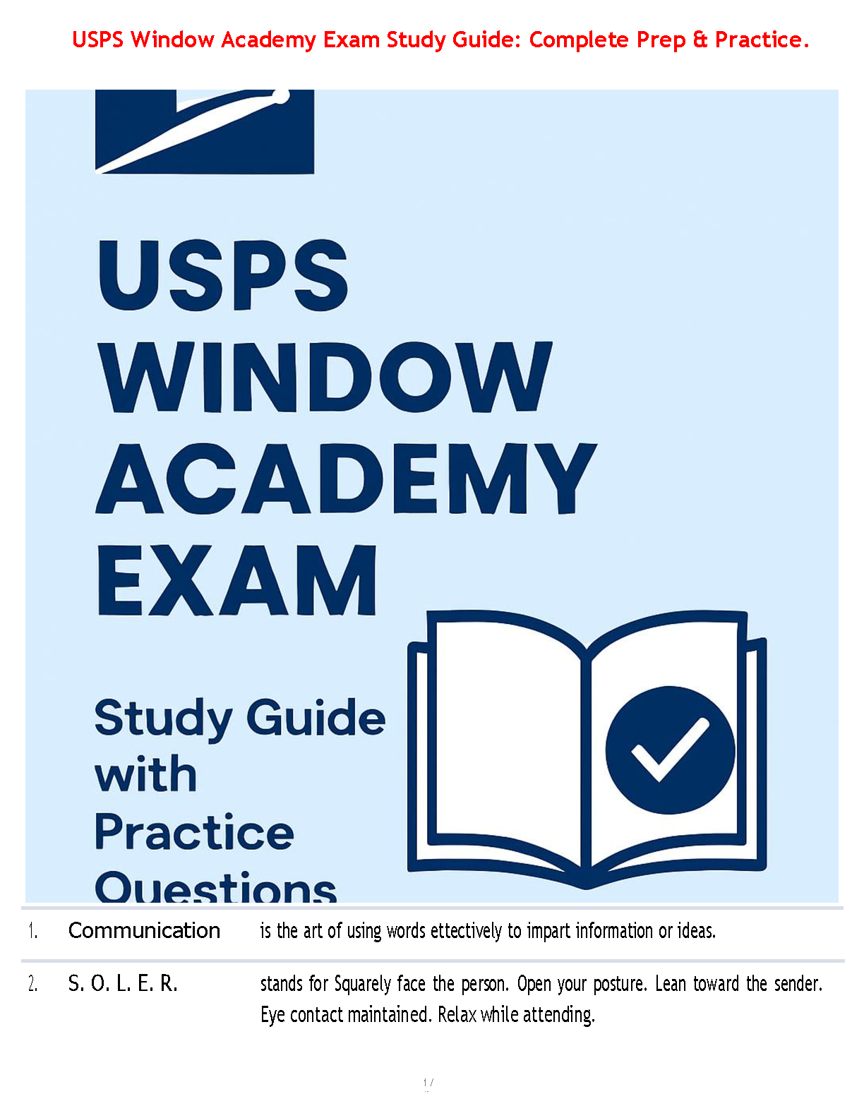 Unlock your full potential for the USPS Window Academy Exam with this ultimate 2025/2026 study guide. Packed with comprehensive content and crucial practice questions, this resource is meticulously crafted to help you master essential topics like effective communication (e.g., S.O.L.E.R.) and confidently achieve a passing score on your very first attempt, saving you time and effort by avoiding resits. Your pathway to a successful USPS career starts here!