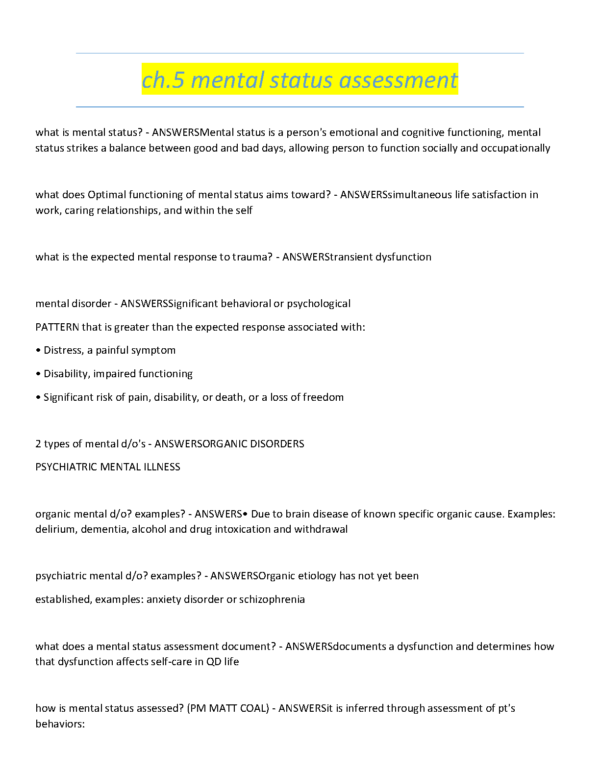 Master the essentials of mental status assessment with this comprehensive test bank for Chapter 5 of Jarvis's Physical Examination and Health Assessment, 9th Edition. Authored by Ann L. Eckhardt and Denise T. Tordella, this resource provides a complete set of questions and verified answers to help you excel in your nursing studies. Dive deep into key concepts including the components of a mental status exam, differentiating between organic and psychiatric disorders, and understanding conditions like delirium, dementia, and anxiety. This study guide is your ultimate tool for acing your exams, building a strong foundation for the NCLEX, and confidently applying assessment skills in clinical practice.