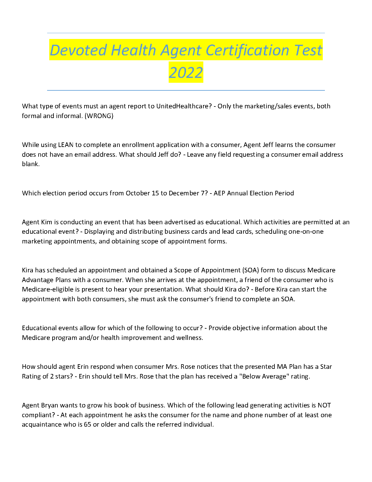 Devoted Health Agent Certification Test Bank 2025/2026 | Complete Questions and Verified Answers Study Guide