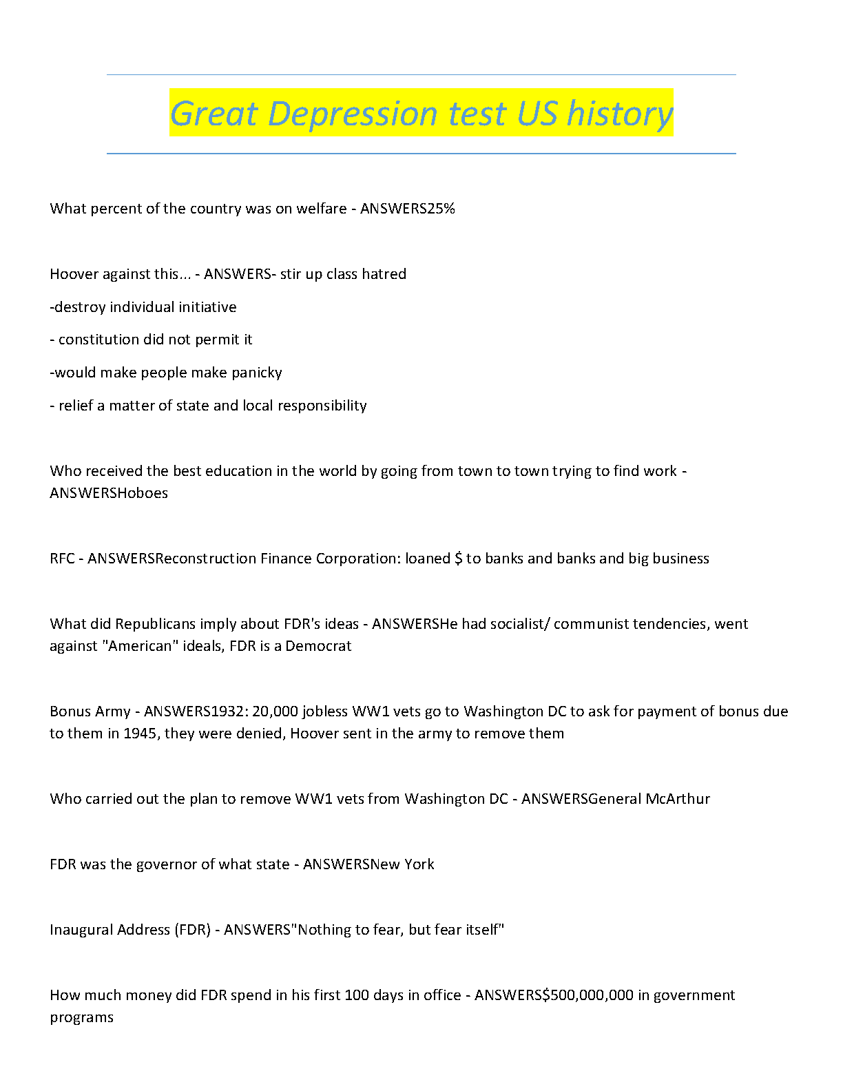 US History: The Great Depression Test Bank | Comprehensive Q&A with Verified Answers