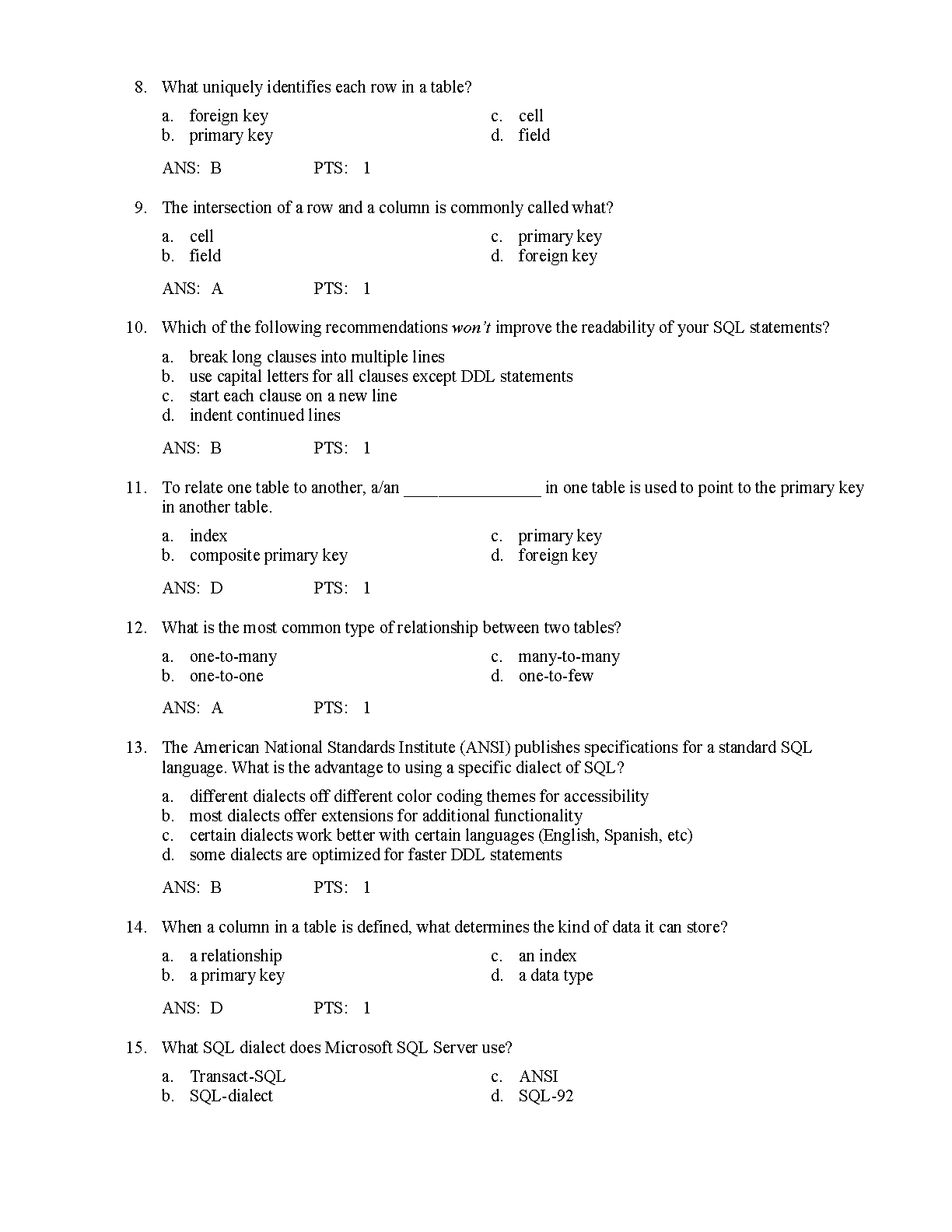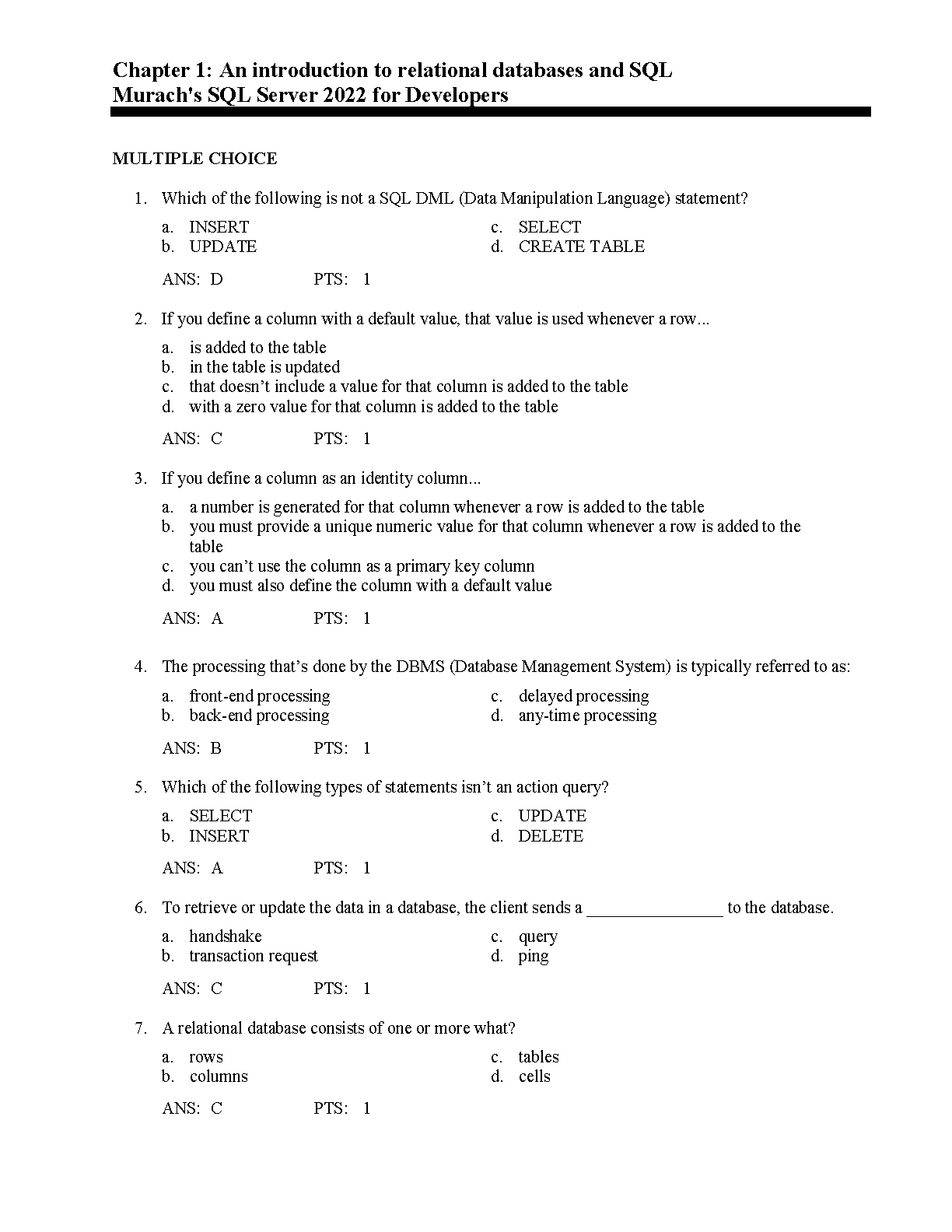 Unlock your full potential and master database development with our complete Test Bank for 'Murach's SQL Server 2022 for Developers' by Bryan Syverson and Joel Murach. This essential study companion provides a full collection of exam-style questions and detailed answers, mirroring the content of the official textbook. Dive deep into key topics from Chapter 1's introduction to relational databases and SQL, all the way through advanced concepts. It's the perfect tool for students aiming to solidify their understanding, practice for exams, and achieve academic success in their SQL Server courses.