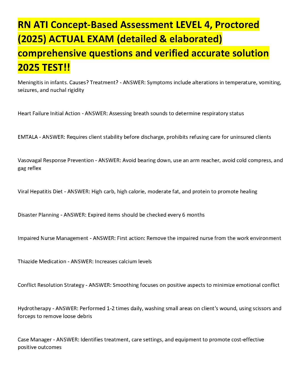 Ace your nursing exams with our definitive guide for the RN ATI Concept-Based Assessment Level 4 Proctored Exam for 2025. This comprehensive resource is packed with actual exam questions and meticulously verified, detailed answers to ensure you have the most accurate and up-to-date information. Covering critical topics such as Heart Failure management, EMTALA regulations, Disaster Planning, and more, this test bank is expertly designed to help you master key concepts and pass on your first attempt. Stop worrying about resits and start studying smarter with our proven 2025 ATI test guide.