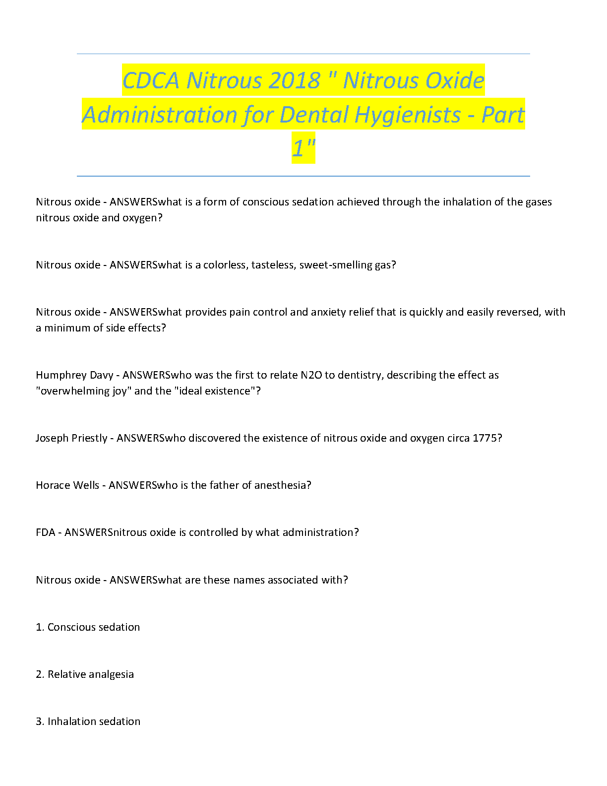 Ace your CDCA certification with the comprehensive Test Bank for the 2018 Nitrous Oxide Administration for Dental Hygienists Exam. This study guide (Part 1) provides a complete set of verified questions and detailed answers, covering all essential topics. Master concepts such as the properties and effects of nitrous oxide, key historical figures like Humphry Davy and Horace Wells, fundamental terminology including conscious sedation and relative analgesia, and regulatory oversight by the FDA. This Q&A resource is expertly designed to help you prepare efficiently, build confidence, and pass your dental hygienist certification exam with ease.