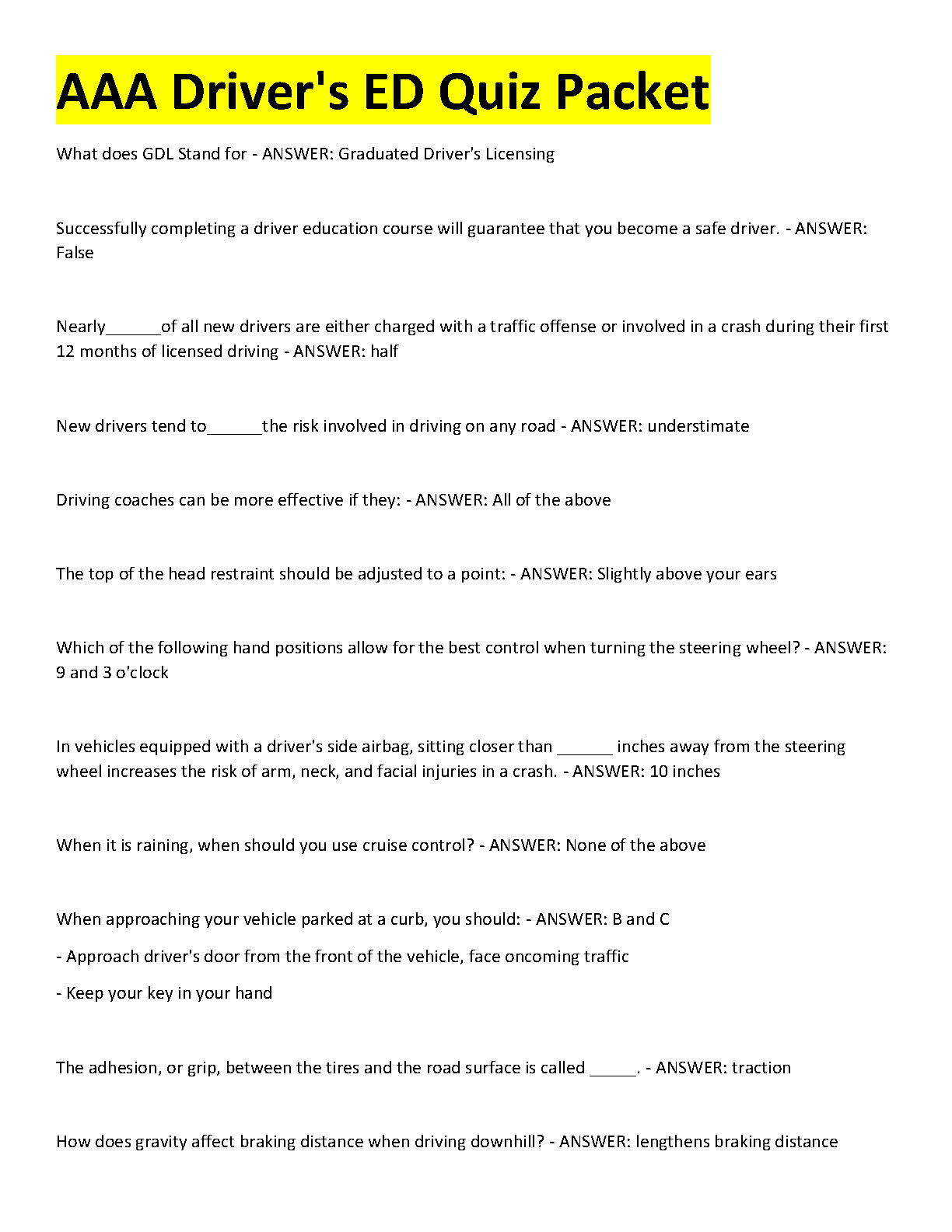 Ace your AAA Driver's Education course with this essential Quiz Packet Test Bank. This comprehensive study guide features a wide range of questions and verified answers covering all critical topics for new drivers. Master concepts like Graduated Driver’s Licensing (GDL), safe vehicle operation, defensive driving techniques, traffic laws, and handling your vehicle in various conditions. This resource is designed to help you study effectively, build confidence, and pass your driver's ed test with ease.
