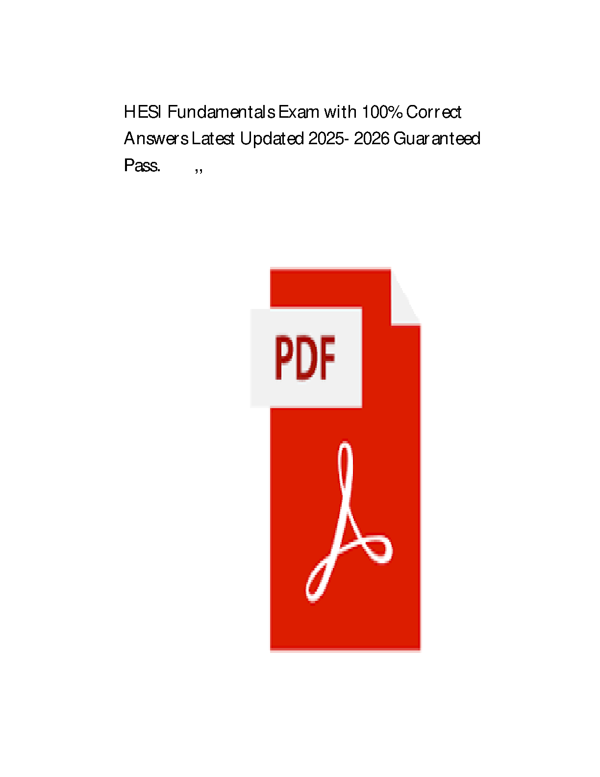 Prepare to excel in your nursing program with the most up-to-date HESI Fundamentals Exam Prep for the 2025-2026 academic year. This essential study guide provides a complete set of questions paired with 100% accurate and verified answers, ensuring you have the reliable information you need. Our comprehensive Q&A format is strategically designed to help you understand core nursing principles and pass the HESI Fundamentals exam with confidence on your first try. Avoid the stress of retakes and invest in your future success. Get instant access to this invaluable resource and master the material needed to ace your exam.