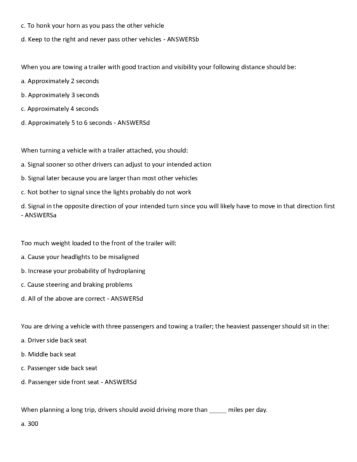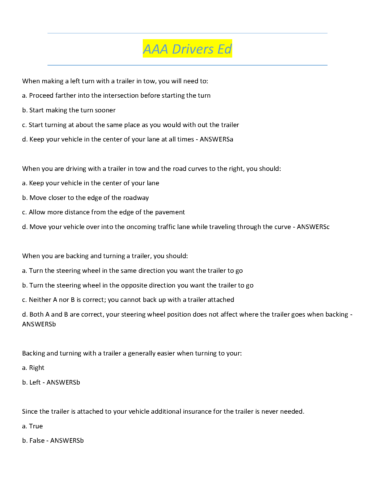 Ace your AAA Driver's Ed exam with our comprehensive test bank for the 2025/2026 year. This essential study guide features a wide array of practice questions, each paired with a verified answer, covering critical topics like maneuvering with a trailer, road safety rules, and more. Designed to help you study smarter, not harder, this resource is your key to mastering the material and passing your driving test on the first attempt. Avoid the stress of a resit and get on the road with confidence!