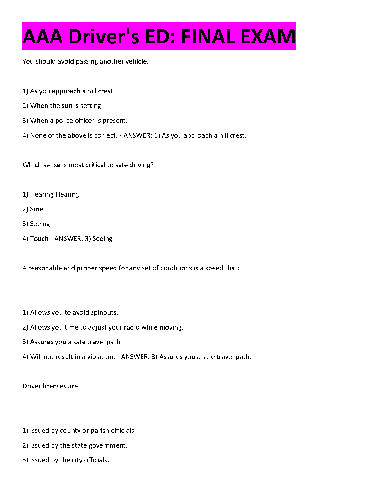 Get ready to ace your AAA Driver's Education Final Exam with our complete test bank for the 2025/2026 academic year. This essential study guide contains a wide range of multiple-choice questions, each with a verified, correct answer, covering all critical topics you'll face on the test. From traffic laws and defensive driving techniques to road signs and safety procedures, this resource is designed to help you study efficiently and pass your driver's ed exam on the very first attempt. Avoid the stress of resits by mastering the material with this comprehensive and easy-to-use Q&A compilation. Download now and drive your way to success!
