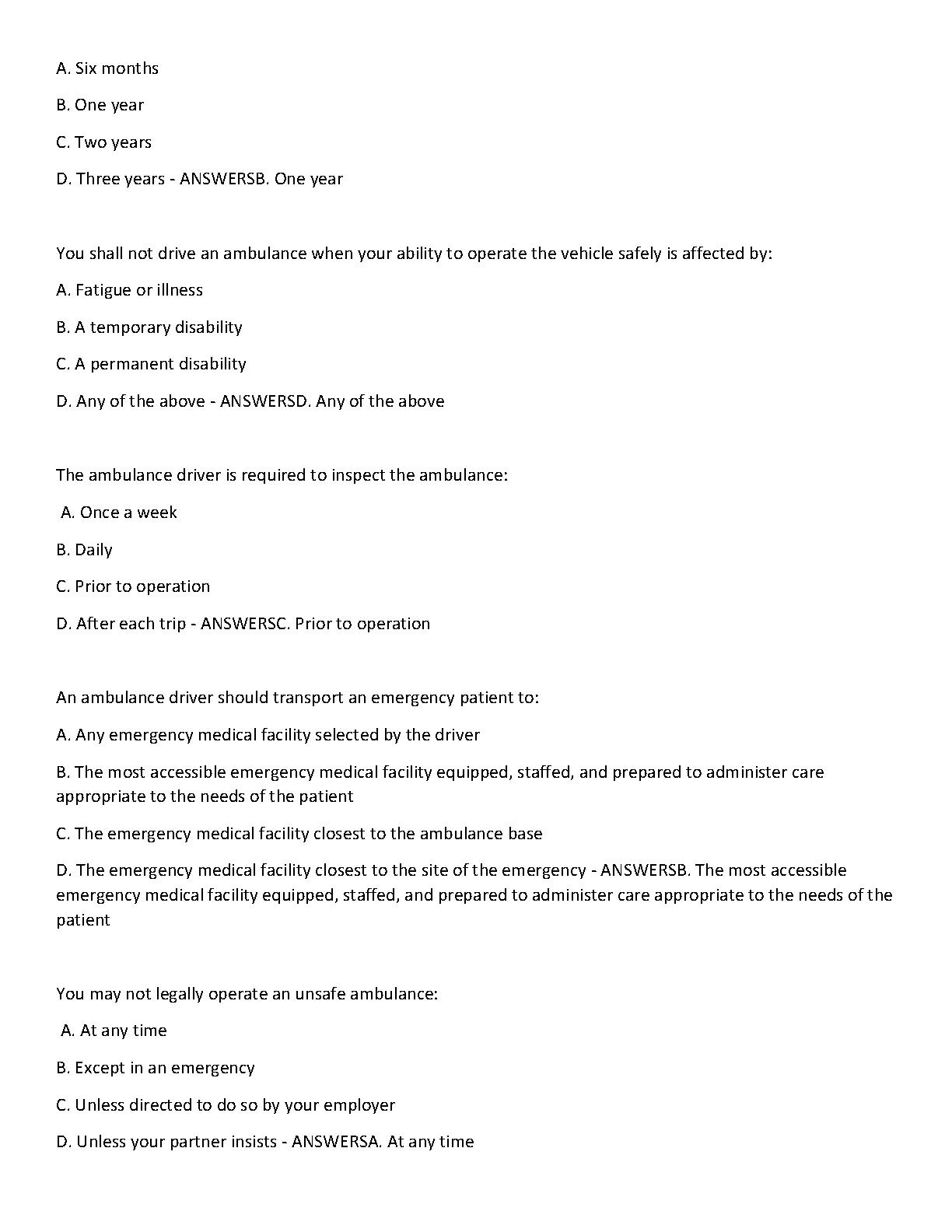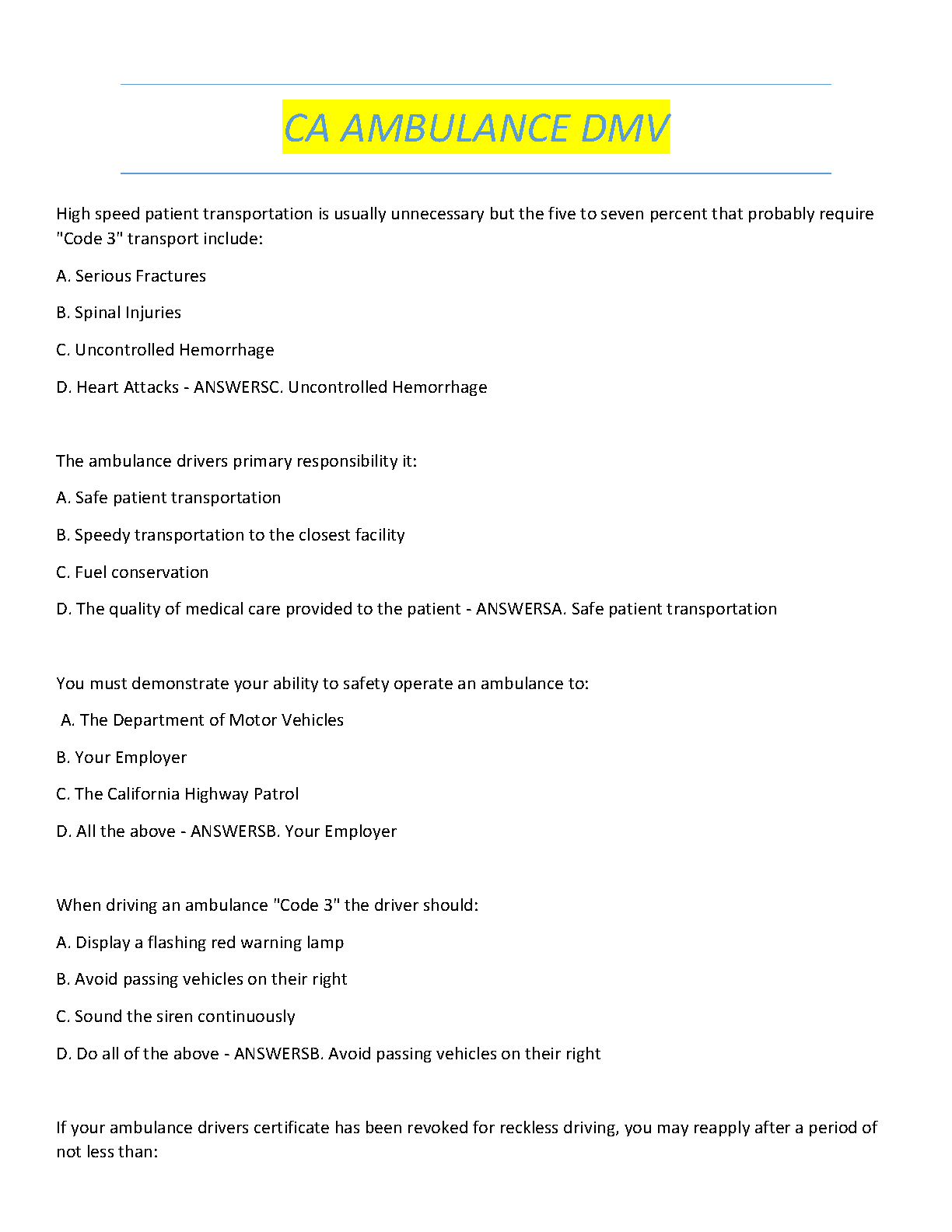 Ace your California Ambulance Driver certification test with this comprehensive test bank. This resource provides a detailed collection of practice questions and answers, mirroring the format and content of the official CA DMV Ambulance Driver exam. Master key topics such as Code 3 operations, patient transport responsibilities, safety procedures, and state regulations. Study effectively and gain the confidence you need to pass your exam on the first try and earn your certificate.