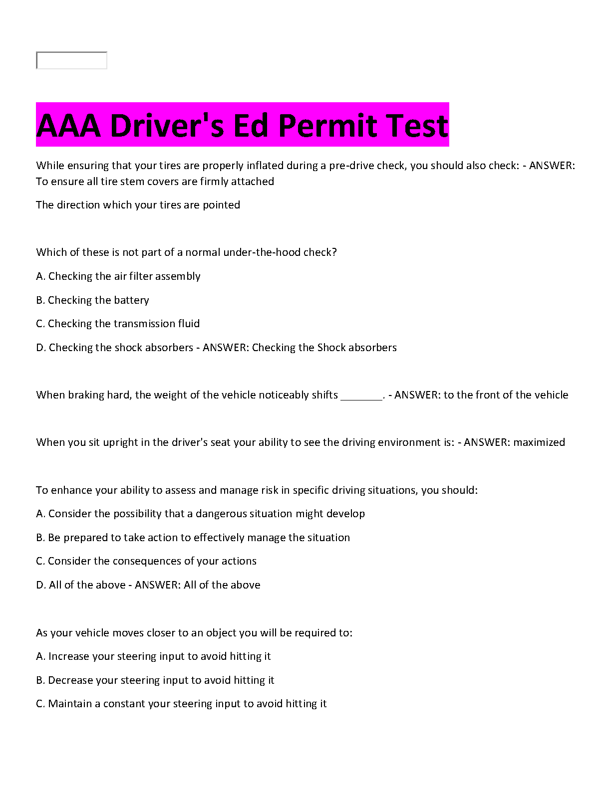 Get ready to ace your AAA Driver's Education Permit Test with our comprehensive study guide for the 2025/2026 testing season. This resource is packed with the latest questions and expertly verified answers, covering everything from essential pre-drive vehicle checks and under-the-hood knowledge to critical risk management and safe driving techniques. This detailed test bank is designed to help you understand the material thoroughly, build your confidence, and pass your driver's permit exam on your very first attempt. Avoid the stress of a resit and get on the road faster with this essential study tool.