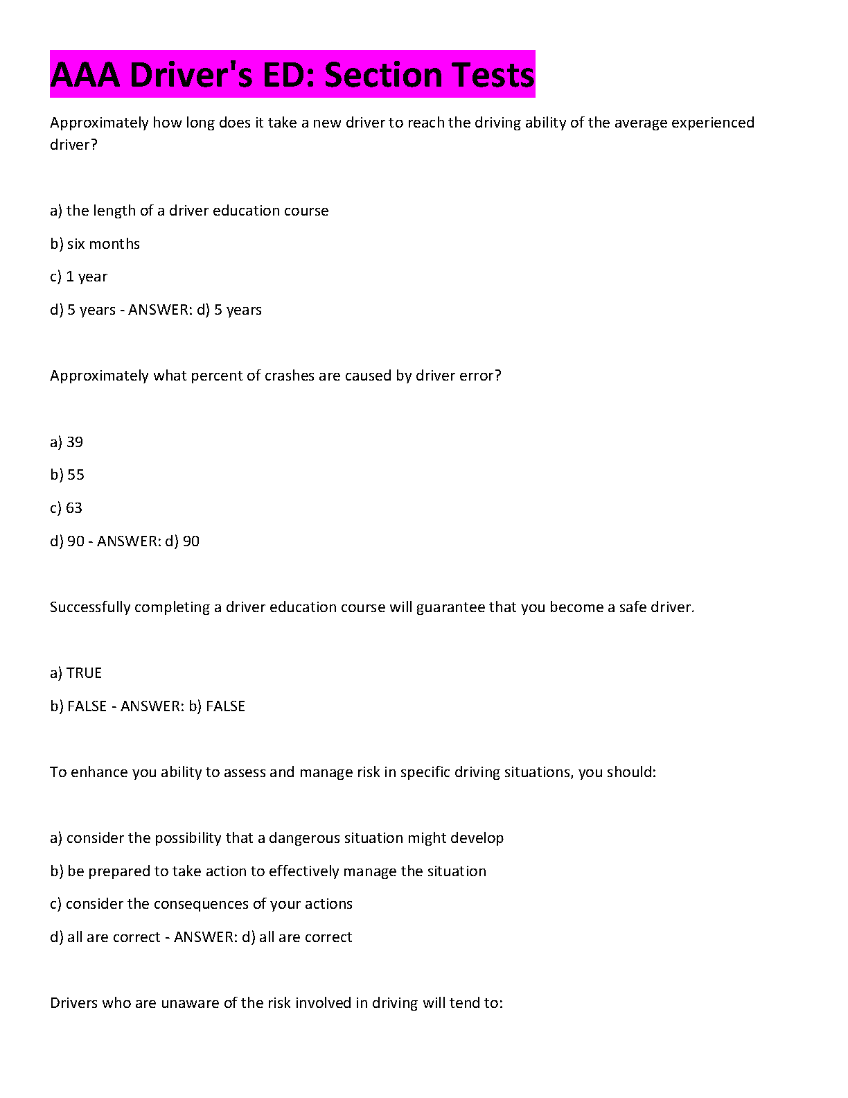 Ace your driver's education exam with this comprehensive test bank for the AAA Driver's ED course. This essential study guide contains a full collection of section test questions, each with verified answers, covering crucial topics like risk management, traffic laws, and safe driving principles. Prepare effectively, build your confidence, and get ready to pass your permit or driver's license test on your very first attempt.