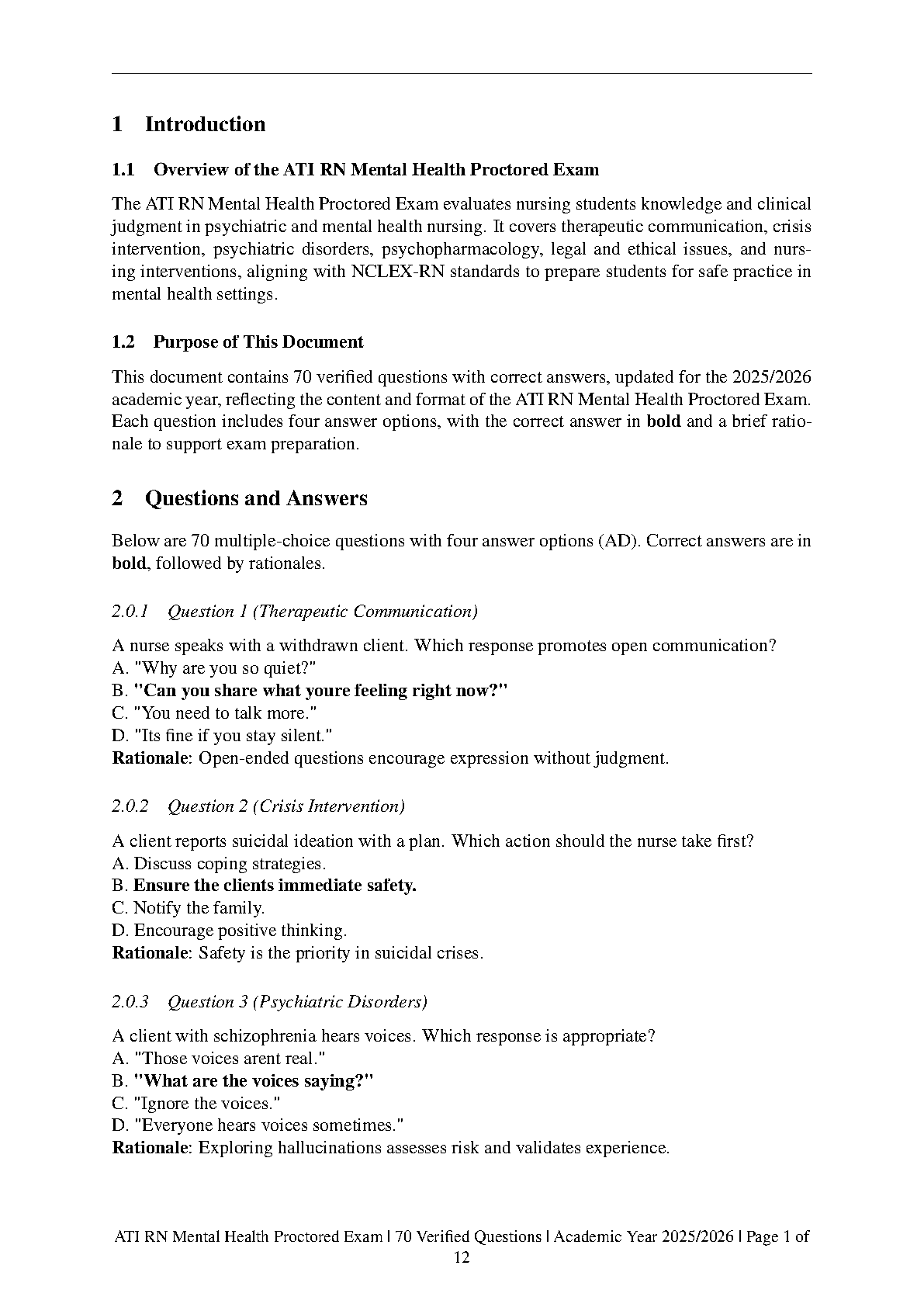 Ace your nursing assessment with our comprehensive study guide for the ATI RN Mental Health Proctored Exam, fully updated for the 2025/2026 academic year. This essential resource features 70 meticulously selected questions and their verified correct answers, designed to help you master key concepts and pass on your very first attempt. Boost your confidence and avoid the stress of resits with this ultimate preparation tool.