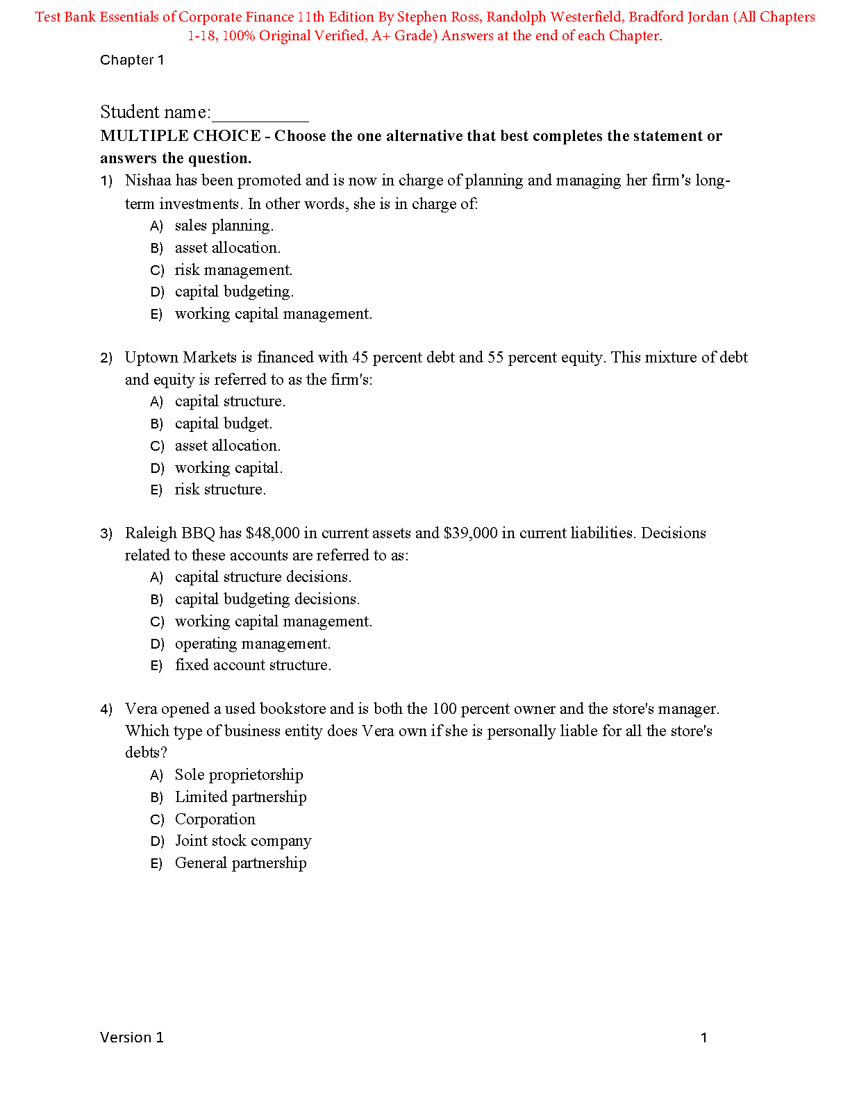Test Bank for Essentials of Corporate Finance, 11th Edition by Stephen Ross, Randolph Westerfield, Bradford Jordan (All Chapters 1-18)