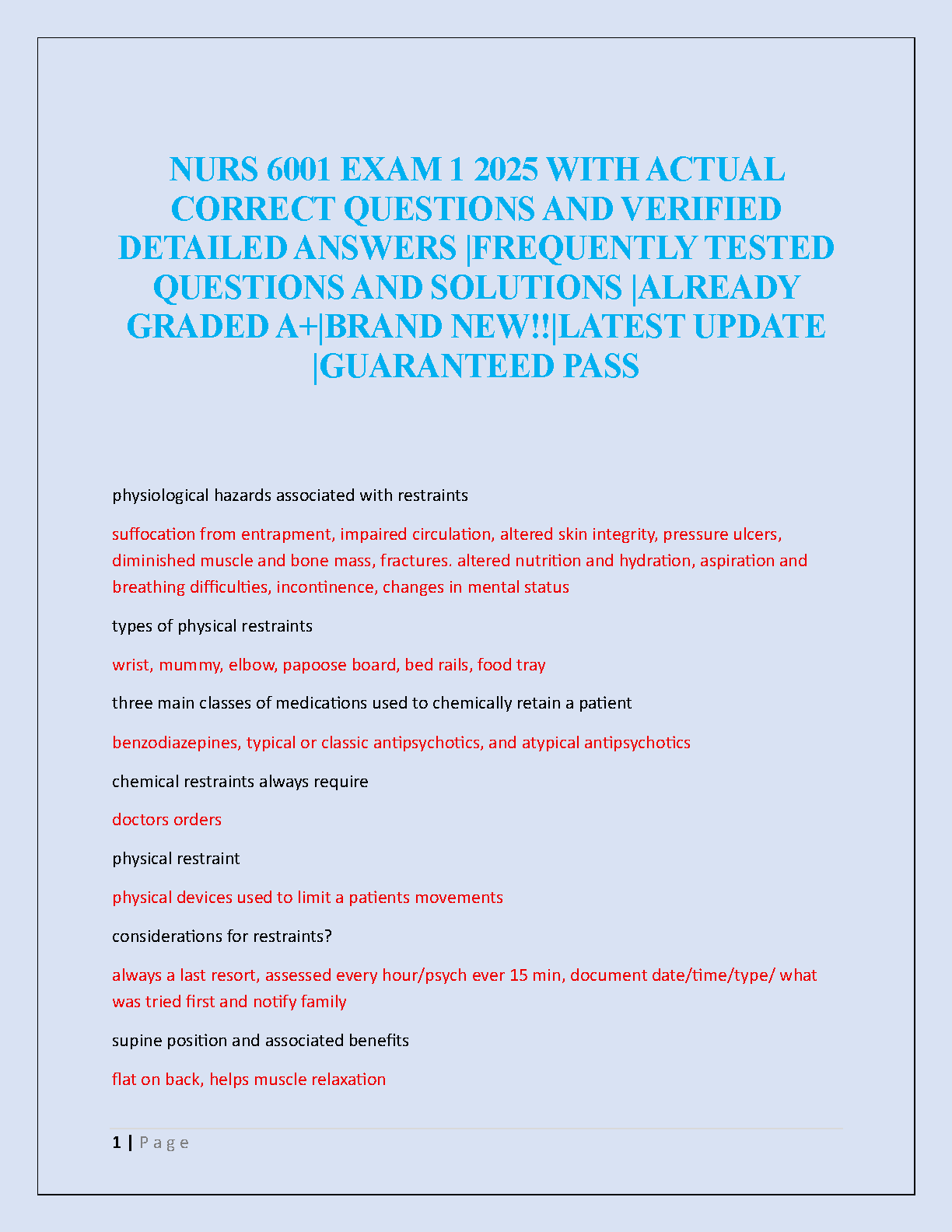 Ace your NURS 6001 Exam 1 with this comprehensive and up-to-date test bank for the 2025/2026 academic session. This premium resource is packed with a wide range of frequently tested questions and meticulously verified, detailed answers to ensure you have a deep understanding of the course material. Topics include critical nursing concepts such as patient safety and restraints. Designed to help you study smarter, not harder, this guide is your key to achieving an A+ grade and passing your exam with confidence on the very first attempt. Get immediate access to the latest update and guarantee your success!