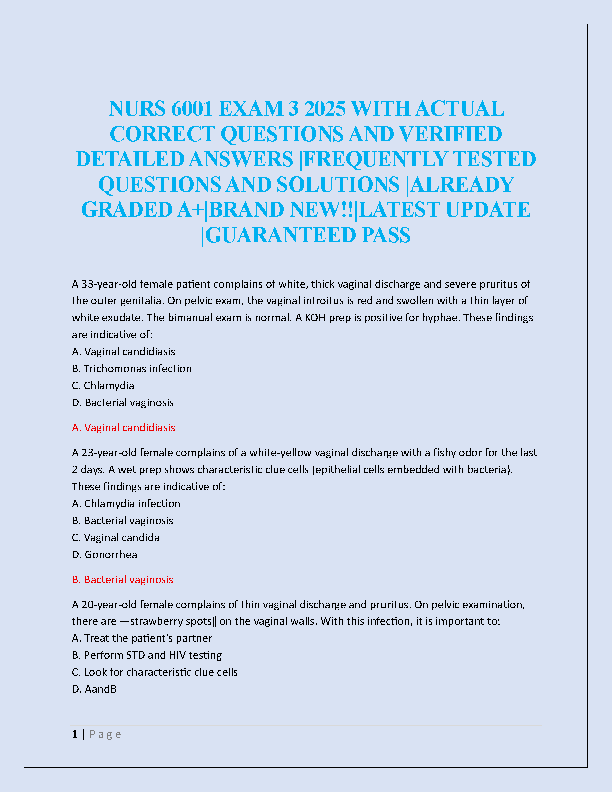 Ace your NURS 6001 Exam 3 with our comprehensive and up-to-date test bank for the 2025/2026 academic year. This premium study resource features a collection of actual exam questions, each accompanied by a verified, detailed answer and rationale. Designed to help you master complex topics in advanced health assessment and diagnostic reasoning, this guide is proven to help students achieve A+ grades. Stop worrying about resits and gain the confidence to pass on your first attempt. Our NURS 6001 Exam 3 test bank is your key to success, providing the most frequently tested questions and solutions to ensure you are fully prepared.