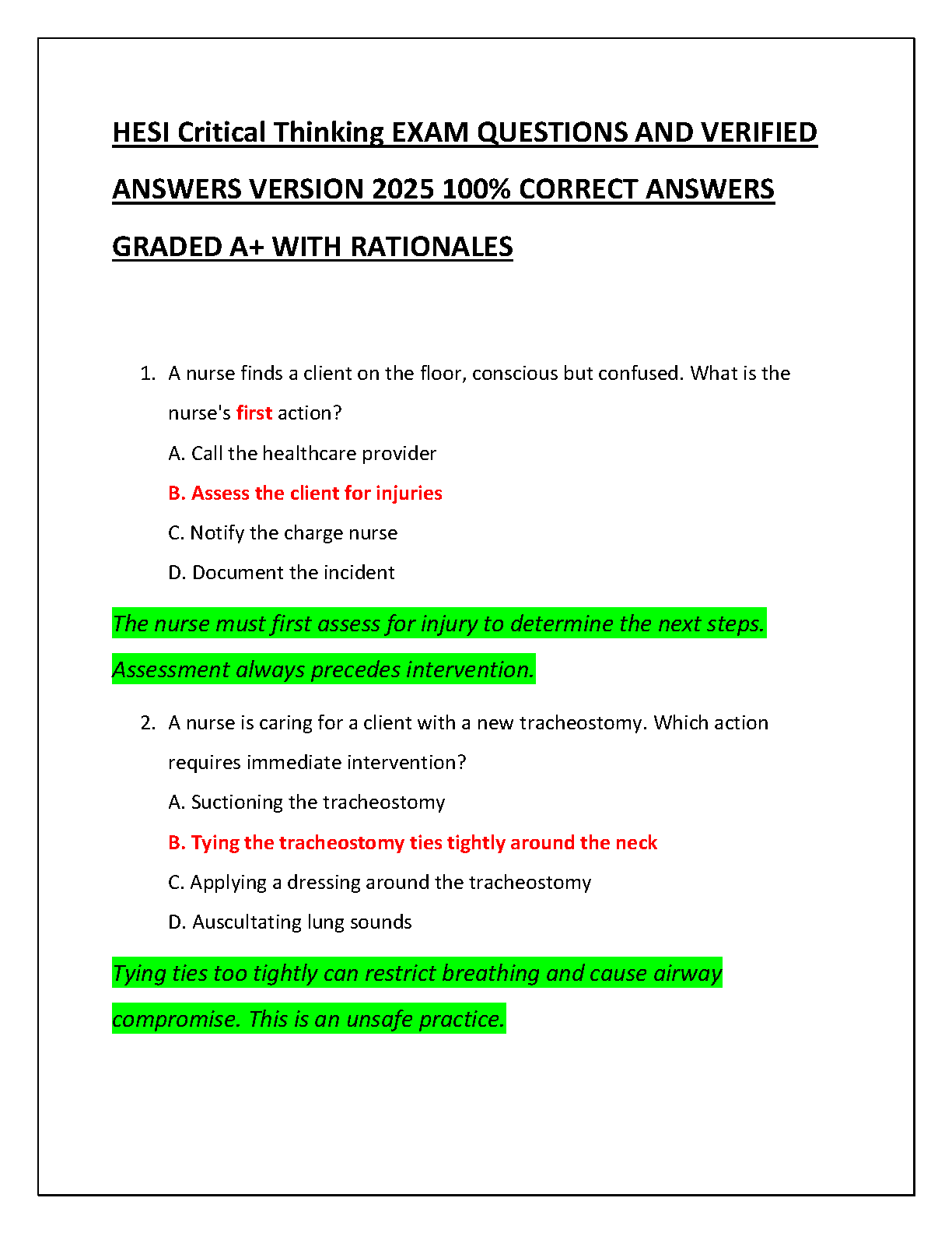 Unlock your full potential and ace the HESI Critical Thinking exam with our brand-new 2025/2026 V2 Test Bank. This essential study guide is meticulously crafted to help you pass on your very first try. Inside, you'll find an extensive collection of exam questions, complete with 100% accurate, verified answers and in-depth rationales for each one. These rationales are key to understanding the 'why' behind each answer, solidifying your critical thinking skills for real-world nursing scenarios. Prepare confidently with A+ graded material and walk into your exam ready to succeed.