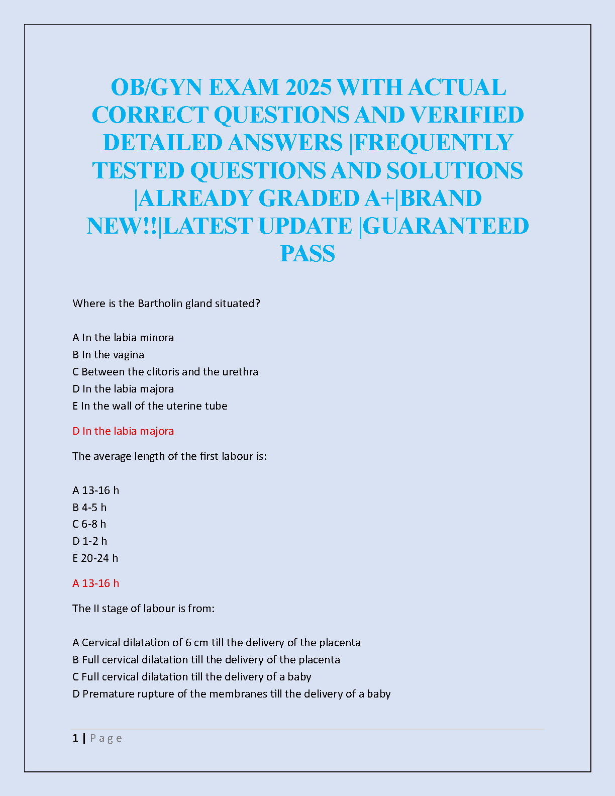 Prepare to excel in your upcoming Obstetrics and Gynecology exams with our comprehensive 2025-2026 Test Bank. This latest edition is packed with actual, frequently tested exam questions, each accompanied by verified, detailed answers and solutions. This resource is already graded A+ and is designed to provide you with the knowledge and confidence you need to pass your OB/GYN exam on the very first attempt. Stop worrying about resits and start studying smart with this guaranteed-to-pass study guide.