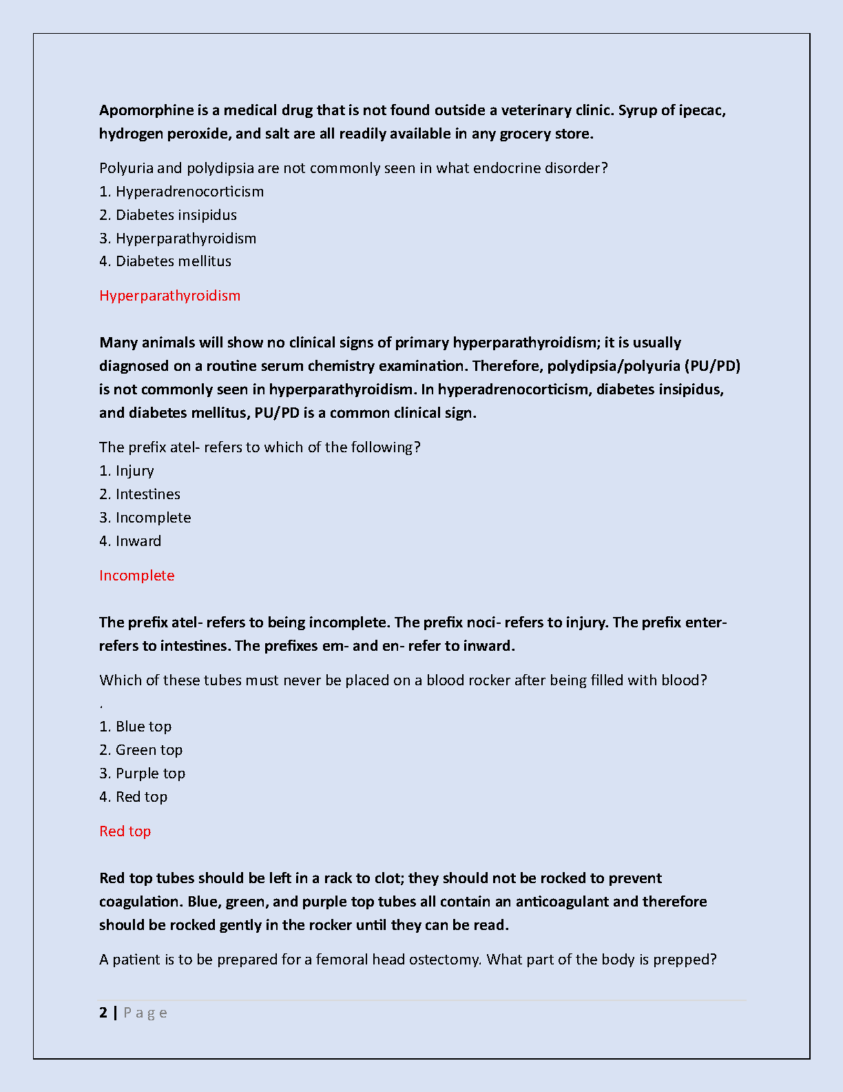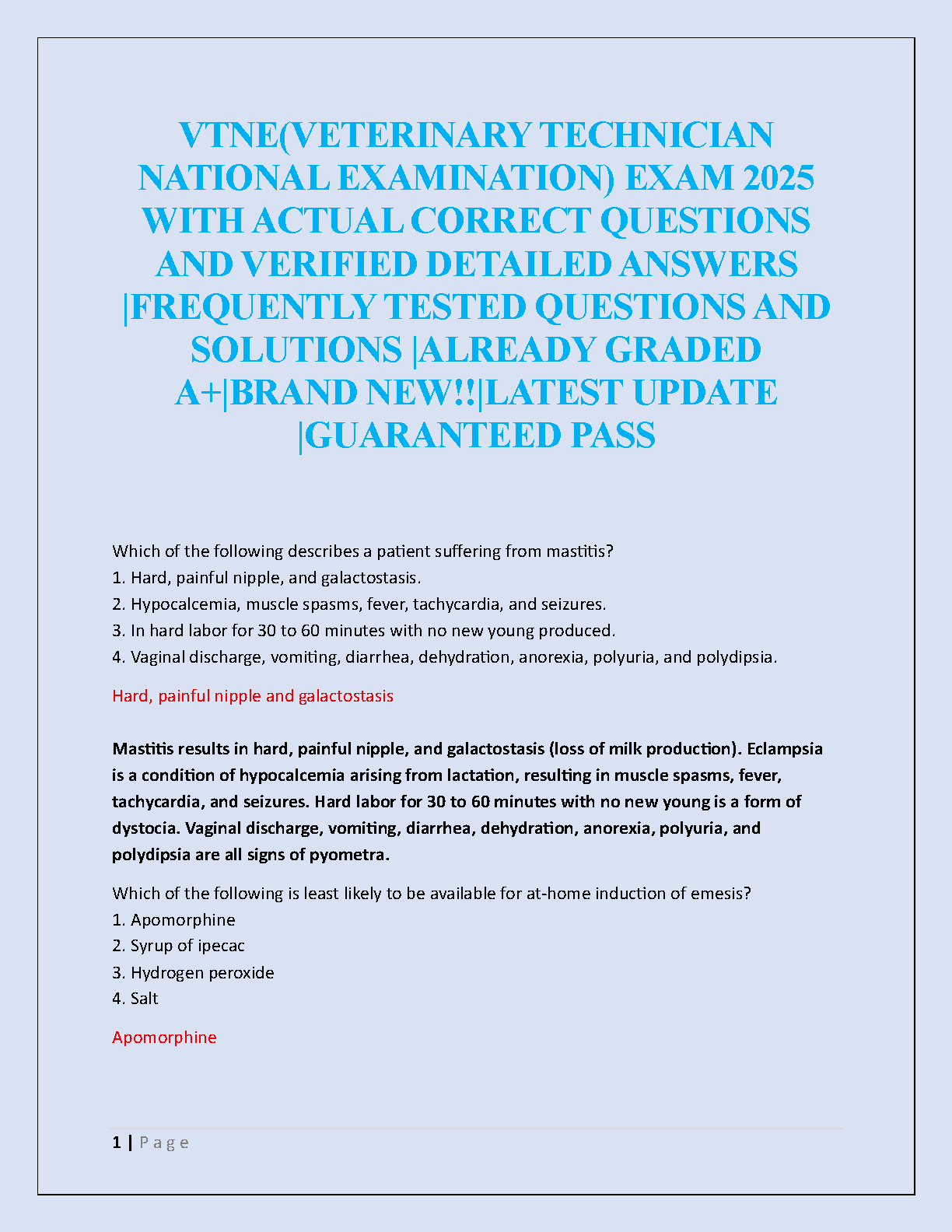 Ace your Veterinary Technician National Examination (VTNE) with our latest 2025 test bank! This comprehensive study guide is packed with frequently tested questions and meticulously verified, detailed answers to ensure you're fully prepared. Each question is already graded A+, providing you with a clear understanding of the material and boosting your confidence. Master key concepts and conquer your exam with this essential resource designed for a guaranteed pass on your first attempt. Download now and take the first step towards your career as a certified veterinary technician!