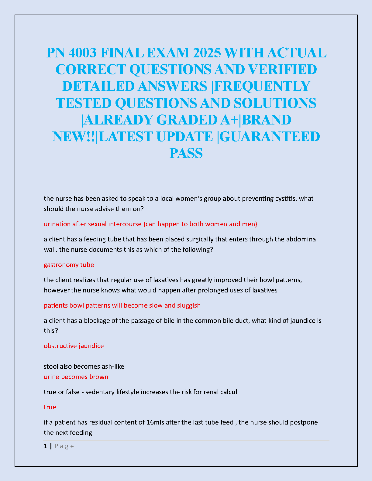 Unlock academic success with the latest 2025/2026 edition of the PN 4003 Final Exam Test Bank. This comprehensive study guide is meticulously compiled with frequently tested questions and verified, detailed answers to ensure you're fully prepared. Covering all essential topics, this A+ graded resource is designed to help you master the material, pass your final exam on the first attempt, and avoid resits. Get the confidence you need to excel in your nursing studies with this guaranteed pass solution.