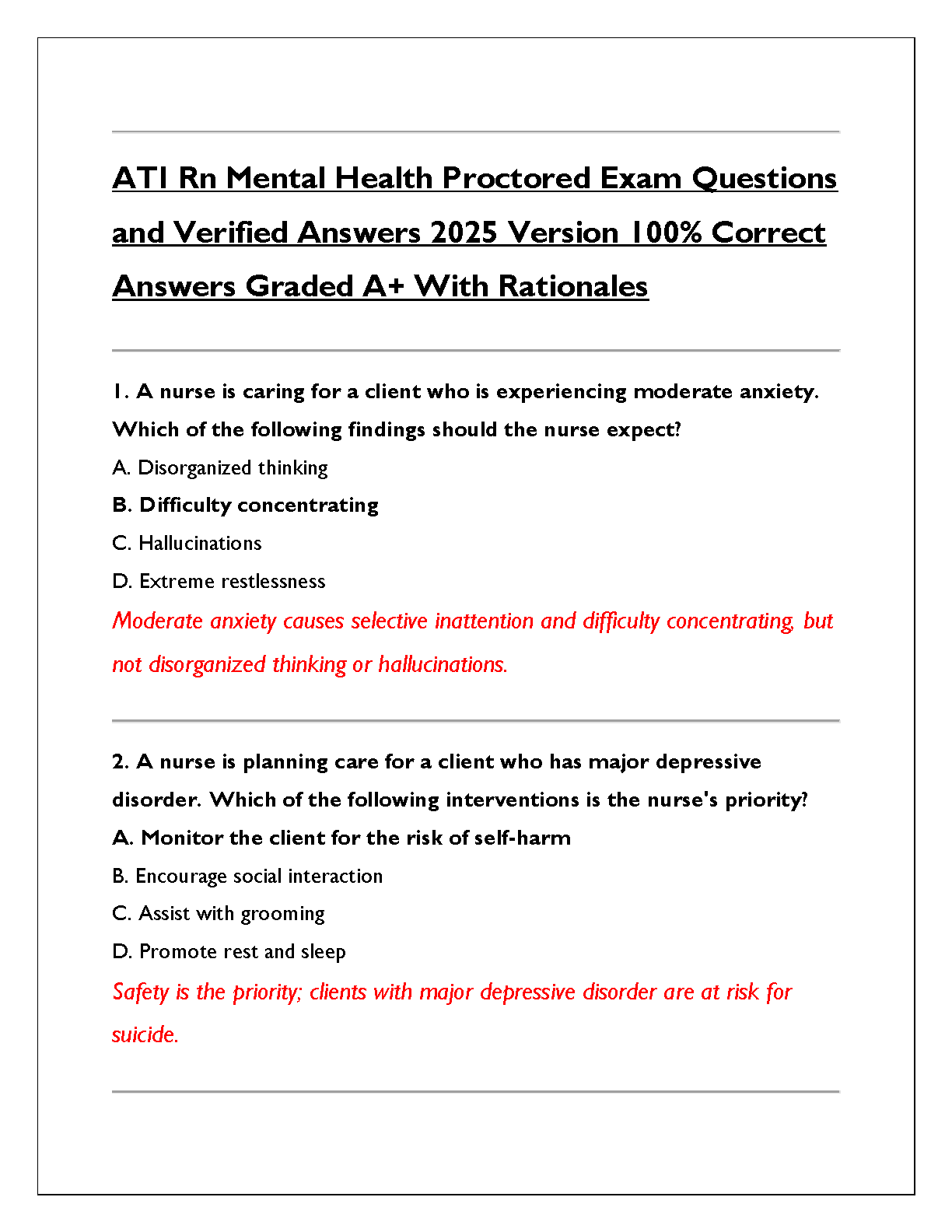 Ace your ATI RN Mental Health Proctored Exam on the first attempt with our latest 2025/2026 edition test bank. This comprehensive study guide is packed with verified exam questions, 100% correct answers, and detailed rationales to deepen your understanding. Designed to help you master key concepts and build confidence, this resource is your key to achieving an A+ grade and avoiding resits. Start studying smarter today!