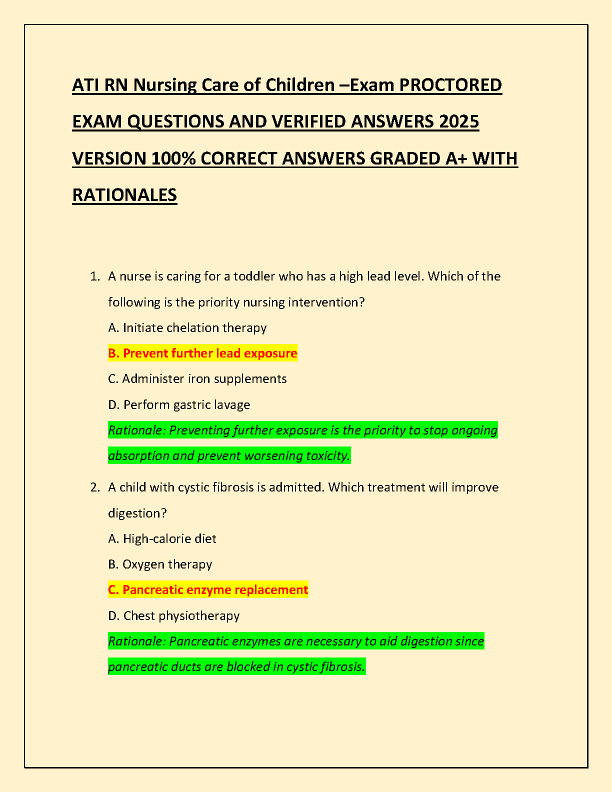 Ace your ATI RN Nursing Care of Children Proctored Exam with our latest and most comprehensive 2025/2026 test bank. This guide is specifically crafted for nursing students aiming to pass on their first attempt, featuring a full range of exam questions with 100% correct, verified answers. Each answer is accompanied by a detailed rationale to ensure a deep understanding of pediatric nursing concepts. Achieve an A+ grade and walk into your exam with confidence by mastering the material with this essential study resource.