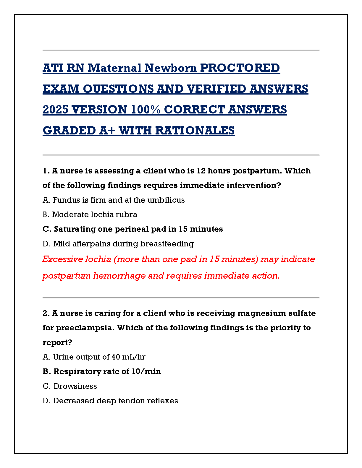 Master the ATI RN Maternal Newborn Proctored Exam with our comprehensive 2025 test bank. This essential resource is designed to help you achieve an A+ grade and pass on your first try, eliminating the need for resits. Inside, you'll find an extensive collection of exam-style questions, each with a verified correct answer and a detailed rationale to deepen your understanding of key nursing concepts. Prepare effectively for topics like postpartum care and preeclampsia management. Boost your confidence and secure your success with this ultimate study guide.