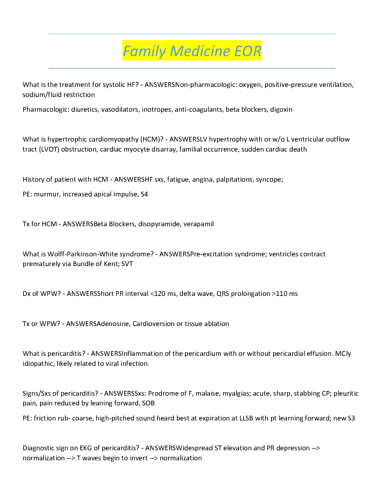 Prepare to excel in your Family Medicine End of Rotation exam with this comprehensive and up-to-date study guide for the 2025/2026 academic year. This resource provides detailed elaborations in an easy-to-follow question-and-answer format, breaking down complex topics into manageable information. Inside, you'll find in-depth coverage of crucial cardiovascular concepts, including the treatment for systolic HF, diagnosis of hypertrophic cardiomyopathy (HCM), management of Wolff-Parkinson-White (WPW) syndrome, and key signs of pericarditis. This study guide is meticulously crafted to give you the knowledge and confidence needed to ace your exam on the first attempt and avoid costly resits.