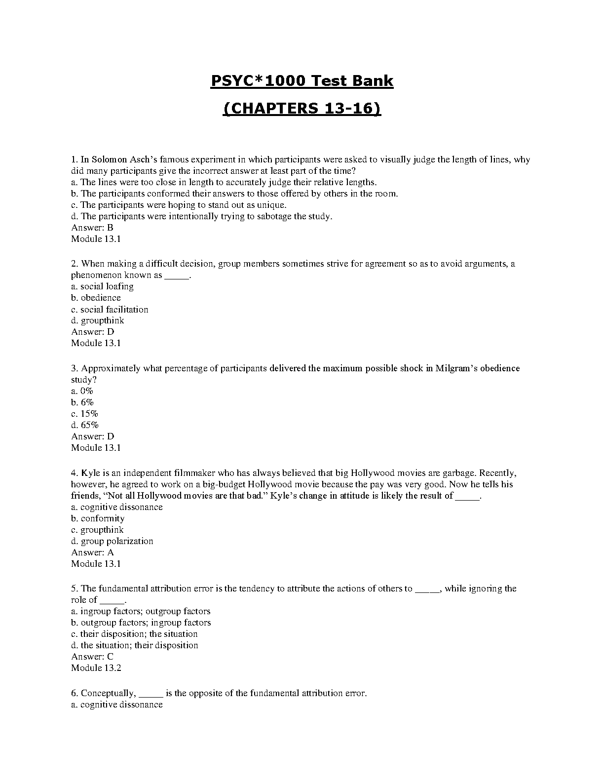 Ace your PSYC 1000 exams with this complete test bank for *Psychology: Themes and Variations, 5th Canadian Edition* by Weiten and McCann. This digital resource provides an extensive collection of multiple-choice questions with verified answers, focusing specifically on Chapters 13-16. Dive deep into crucial social psychology concepts like conformity, obedience, groupthink, cognitive dissonance, and attribution theory. This essential study tool is perfectly designed to help you practice for your exams, test your understanding of key topics, and build the confidence needed to excel in your introductory psychology course. Download today to streamline your studying and achieve a top grade!