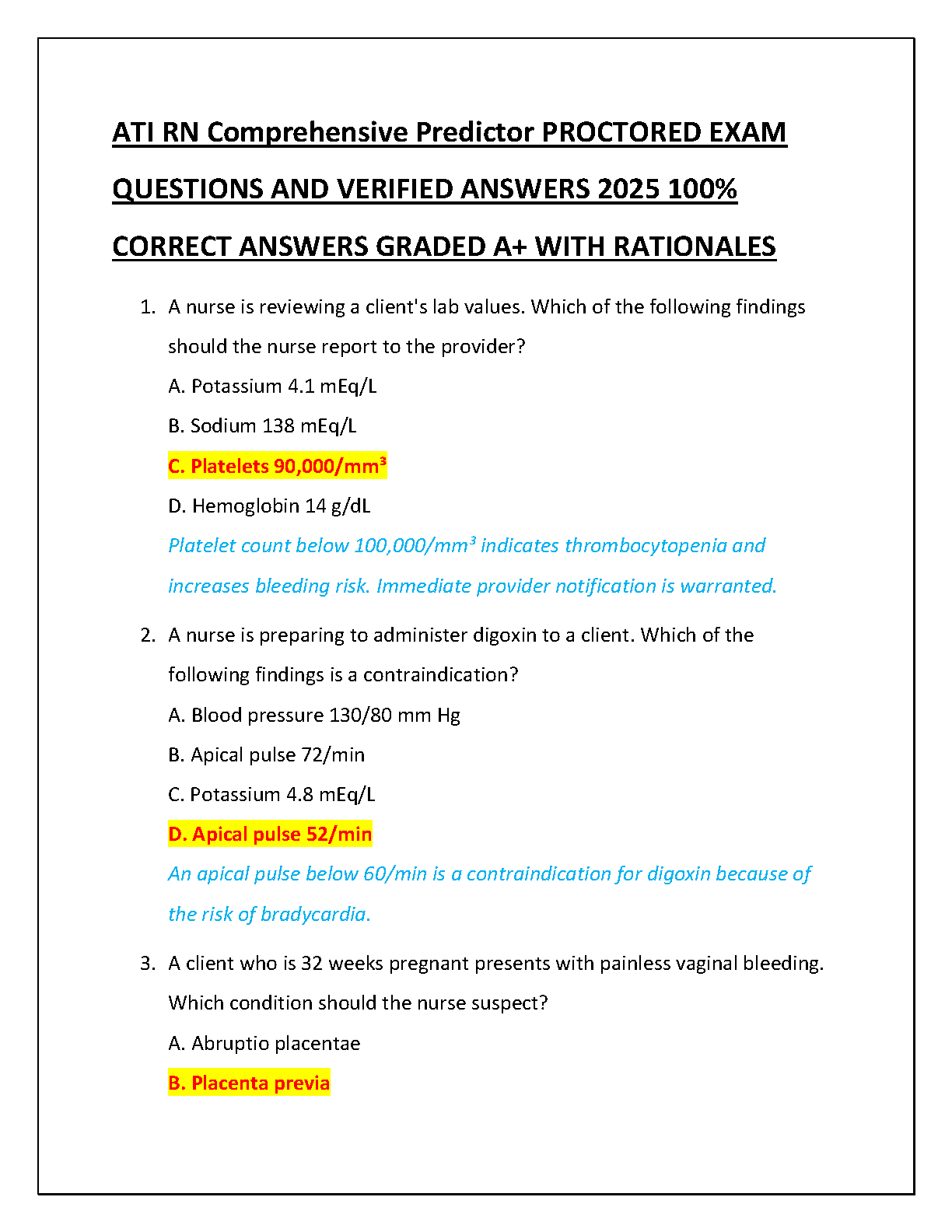 Prepare to excel on your nursing exams with our latest 2025/2026 study guide for the ATI RN Comprehensive Predictor Proctored Exam. This essential resource is meticulously crafted to ensure you pass on your first attempt, featuring a complete collection of exam questions with 100% verified answers. Each answer is accompanied by a detailed, easy-to-understand rationale, helping you grasp the core concepts, not just memorize facts. Achieve an A+ grade and walk into your proctored exam with confidence. This is the ultimate tool for nursing students aiming for success and to avoid costly resits.