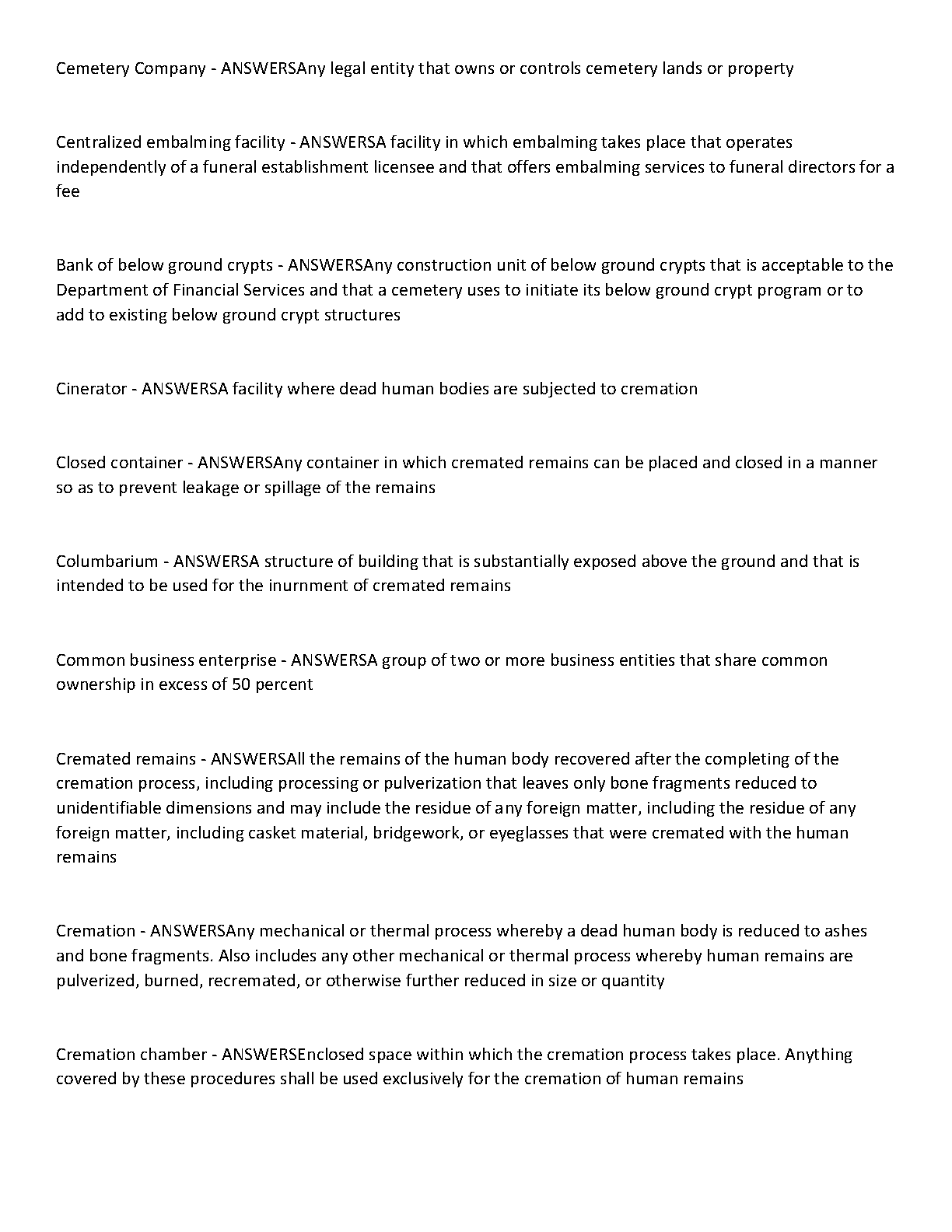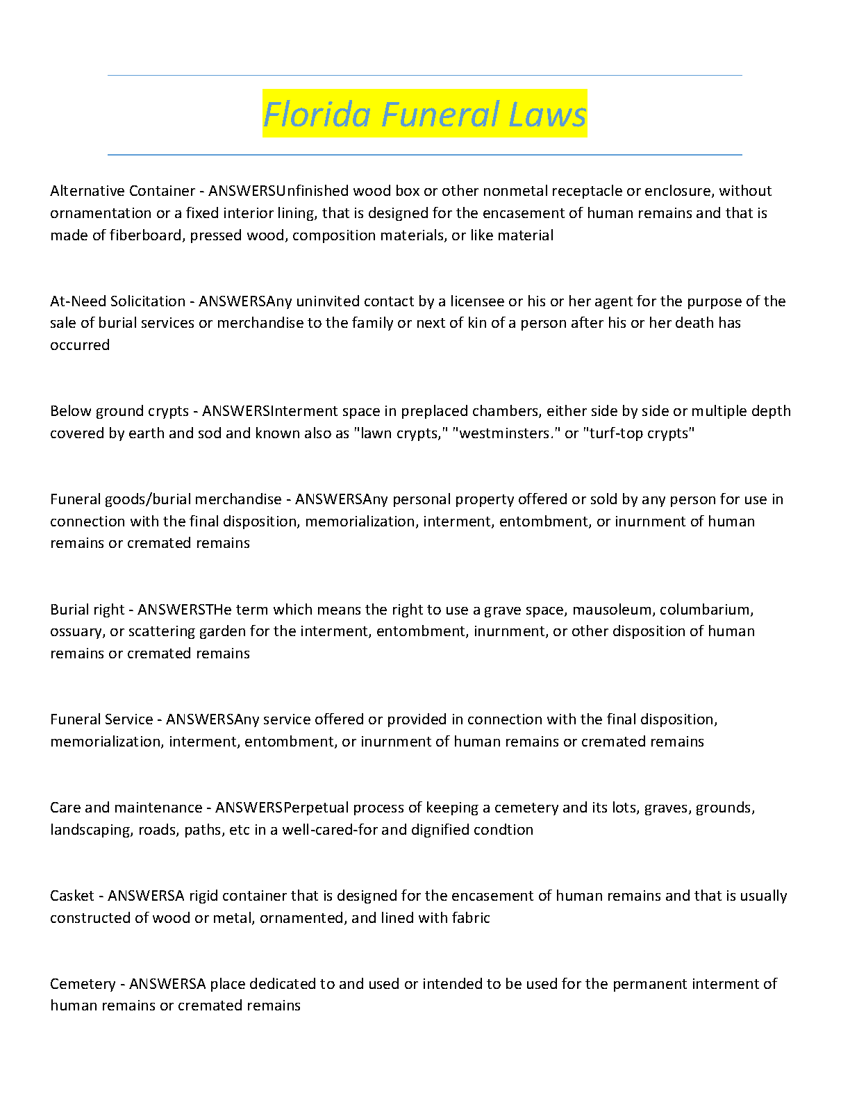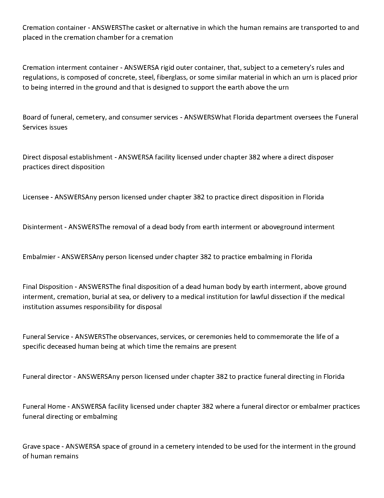 Ace your Florida funeral director and embalmer licensing exams with our comprehensive and up-to-date study guide for the 2025/2026 academic year. This essential resource provides a detailed Q&A format covering all critical terminology and definitions you need to know, from 'Alternative Container' and 'At-Need Solicitation' to 'Burial Right' and 'Cemetery'. Each term is paired with a clear, concise answer, making it the perfect tool for efficient study and retention. Designed specifically to help you master the material and pass on your very first attempt, this guide eliminates guesswork and builds your confidence. Avoid costly and time-consuming resits by preparing with the best resource available for Florida Funeral Laws.