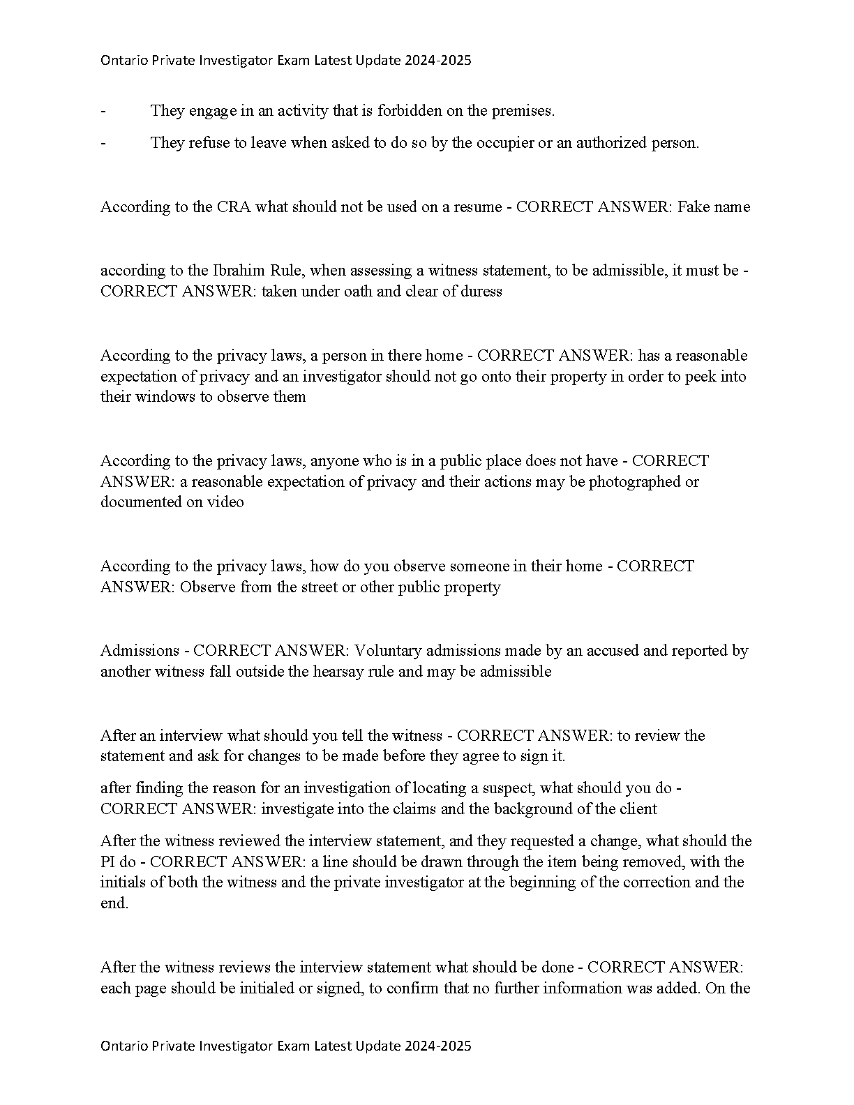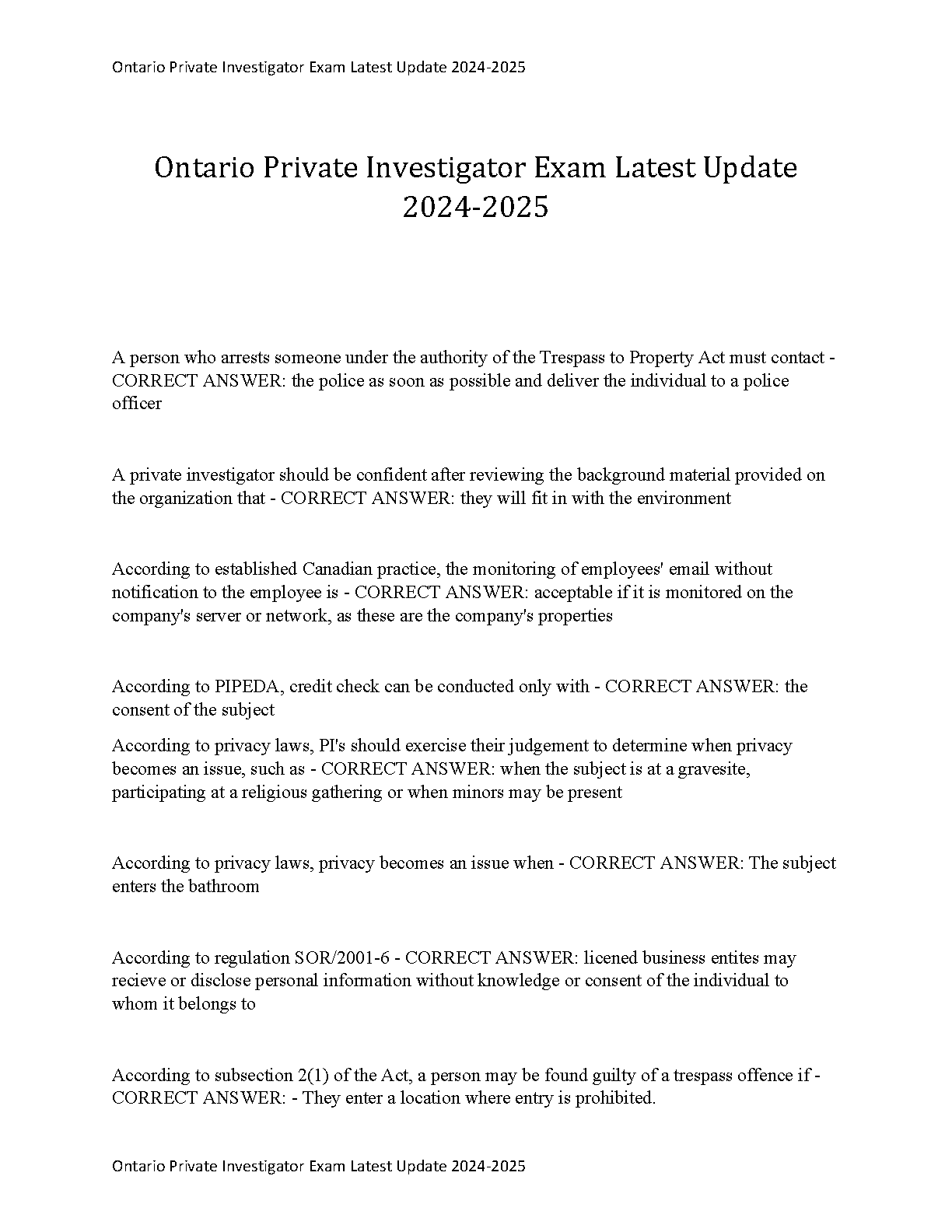 Ace your Ontario Private Investigator (PI) licensing exam on the very first attempt! This comprehensive test bank for the 2025/2026 academic year provides the latest, most accurate questions and verified correct answers. Master crucial topics including the Trespass to Property Act, PIPEDA, Canadian privacy laws, professional conduct, and more. Designed specifically to help you study effectively and confidently, this guide is your ultimate tool to avoid resits and secure your PI license quickly.