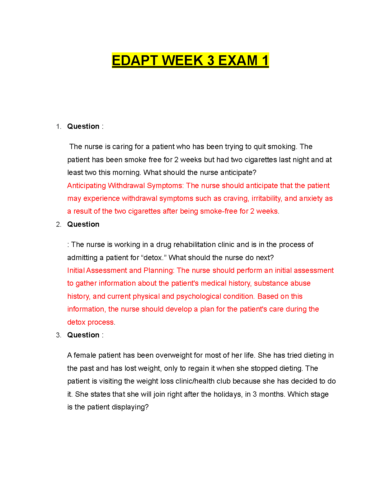 Prepare to excel in your nursing studies with the complete test bank for EDAPT Week 3 Exam 1, updated for the 2025/2026 academic year. This essential study guide provides a comprehensive collection of exam questions paired with detailed, accurate answers and rationales. Dive into key nursing topics such as patient care for smoking cessation, initial assessment for substance abuse detoxification, and understanding patient stages of change. This resource is expertly designed to help you master the material, boost your confidence, and pass your exam on the first try. Say goodbye to exam stress and resits—secure your academic success today!