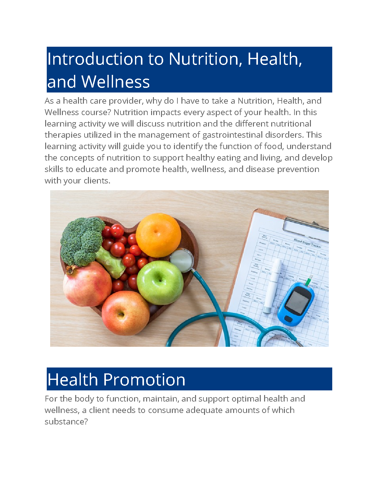 Unlock exam success in your Nutrition 101 course with our latest 2025/2026 study resource for 'Introduction to Nutrition, Health, and Wellness.' This comprehensive guide is expertly designed to help you master the fundamental concepts of nutrition and its critical role in health promotion and disease prevention. Delve into key topics including the function of food, nutritional therapies for gastrointestinal disorders, and strategies for promoting healthy eating and living. Our materials are tailored to ensure you grasp every concept, helping you pass your exams confidently on the first attempt and avoid resits. Ideal for aspiring healthcare professionals.