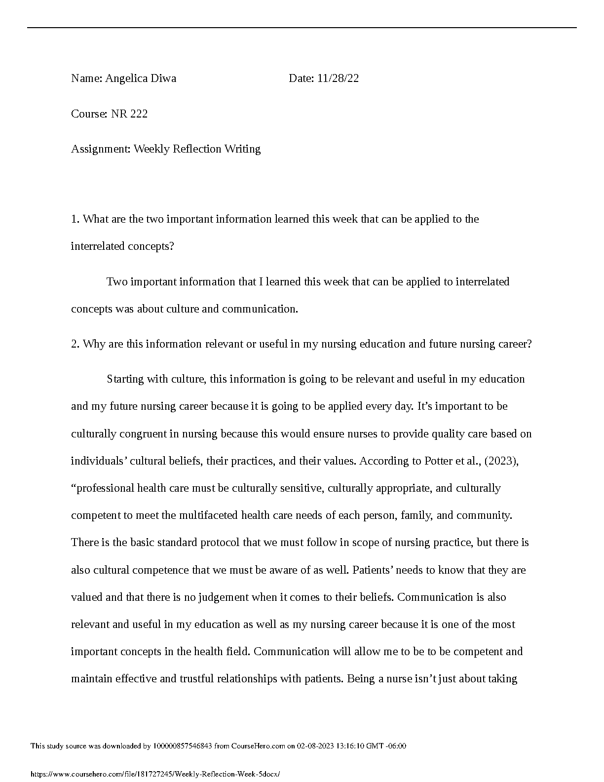 Master NR 222: A+ Weekly Reflection on Culture & Communication | 2025/2026 Exam Prep Based on Potter, Perry, Stockert & Hall's 11th Ed.
