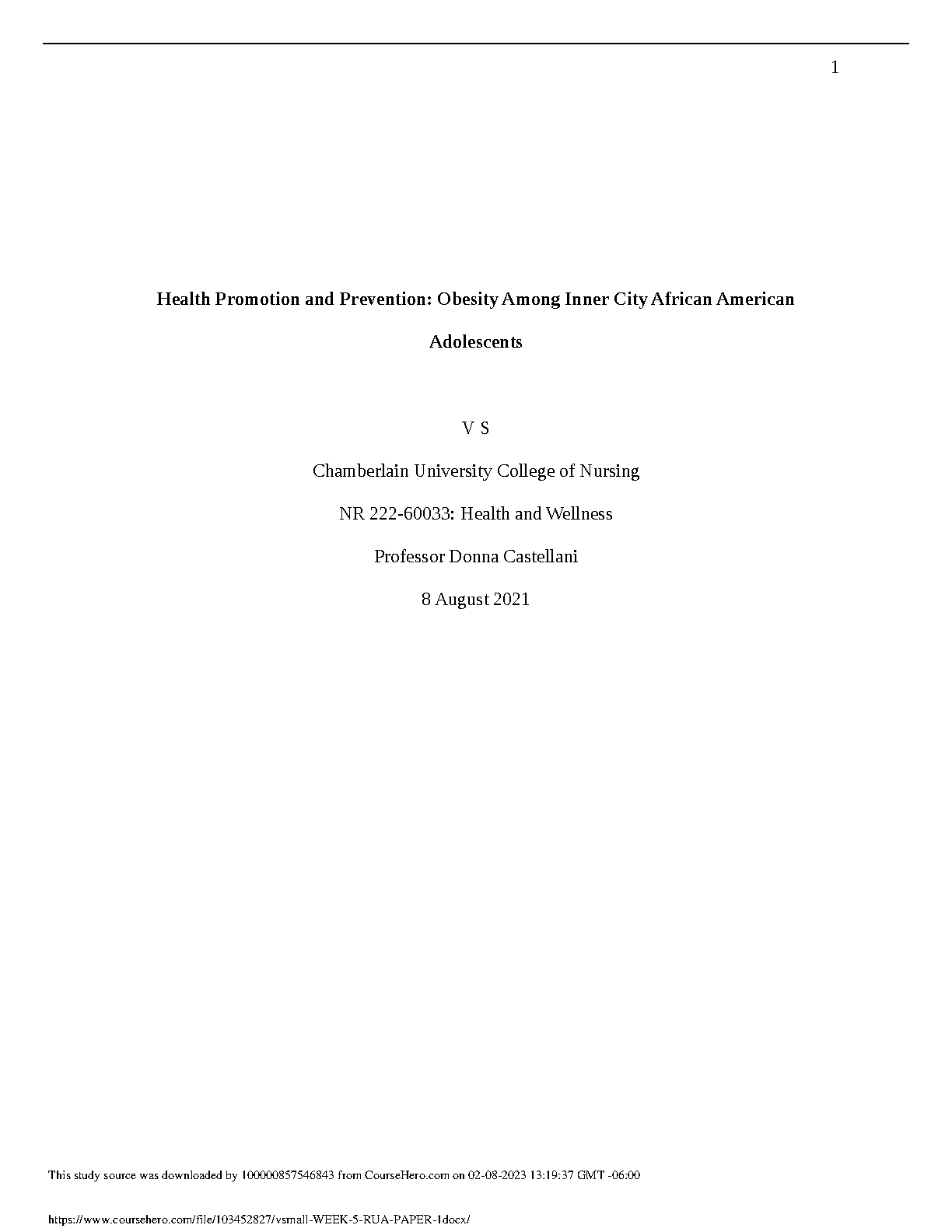 NR 222 Health and Wellness: RUA Paper on Obesity in Adolescents - Chamberlain University Study Guide 2025/2026