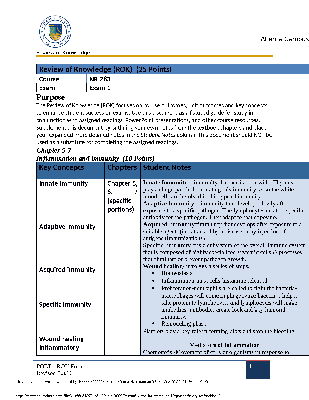 Unlock success in your NR 283 Pathophysiology course with this comprehensive Review of Knowledge (ROK) for Exam 1, fully updated for the 2025/2026 academic year. This essential study guide meticulously covers the critical topics of Inflammation and Immunity, drawing from Chapters 5-7. Dive deep into key concepts including Innate vs. Adaptive Immunity, Acquired and Specific Immunity, the stages of wound healing, and mediators of inflammation. This ROK is expertly designed to supplement your coursework, providing clear, concise notes that will help you master the material and pass your exam on the first attempt. Avoid the stress of resits and confidently prepare with this ultimate study resource for Chamberlain nursing students.