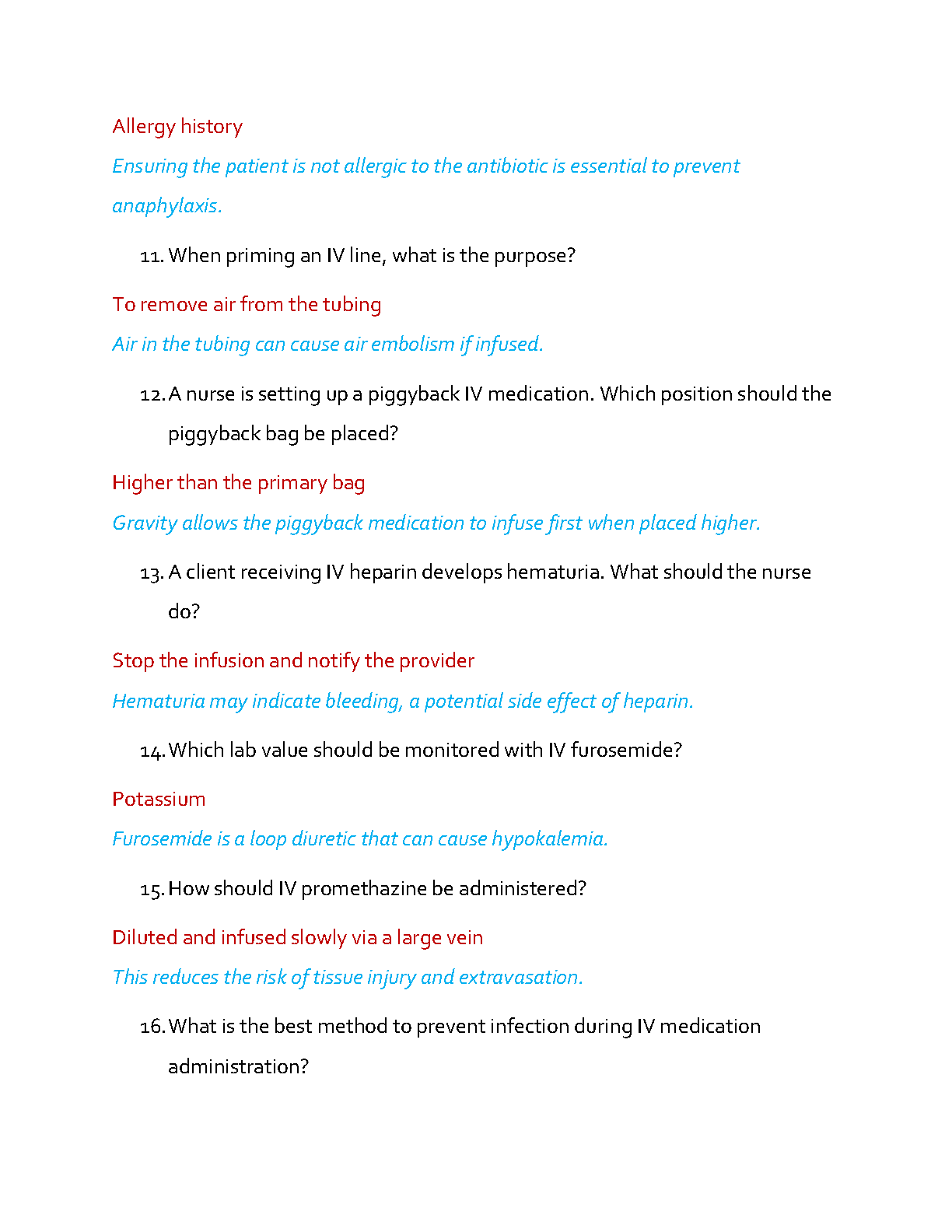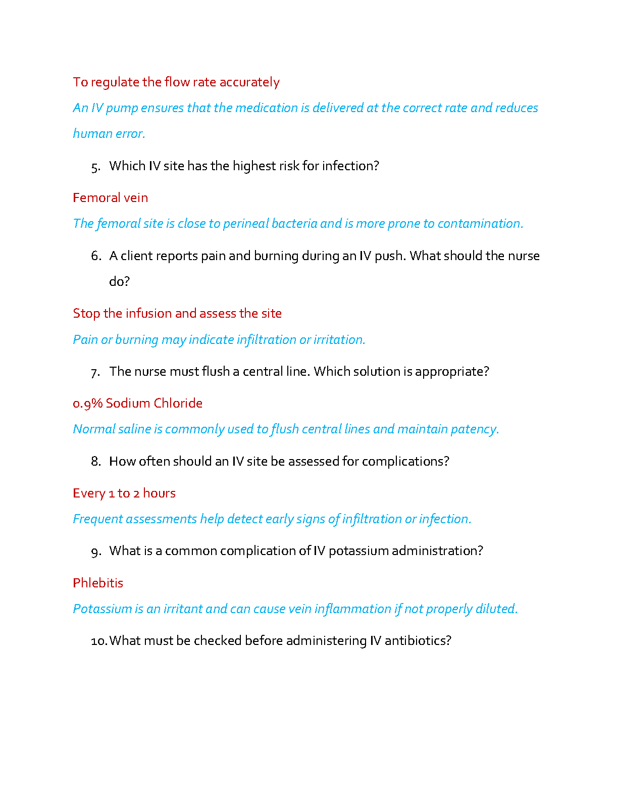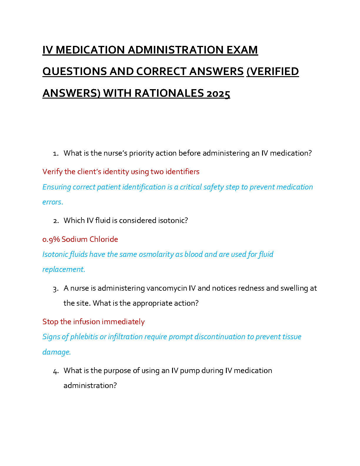 Ace your upcoming IV Medication Administration Exam with this comprehensive and up-to-date test bank for the 2025/2026 academic year. This essential study guide is meticulously crafted to help you pass on your very first try, eliminating the need for costly and stressful resits. Inside, you'll find a complete collection of exam-style questions, each paired with a verified correct answer and a detailed rationale. These rationales are key to your success, as they explain the 'why' behind each answer, solidifying your understanding of critical nursing concepts like patient identification, isotonic solutions, managing complications like phlebitis, and the proper use of IV pumps. Prepare effectively, build your confidence, and master the skills needed for safe and competent IV medication administration.