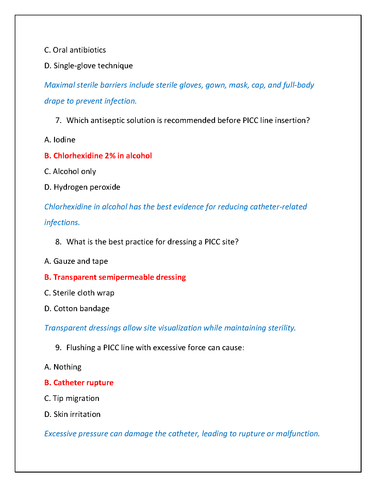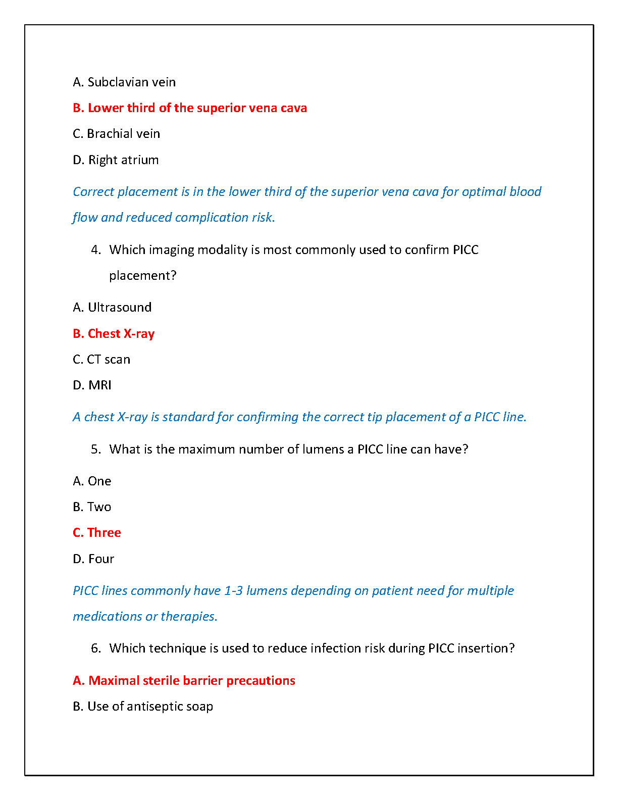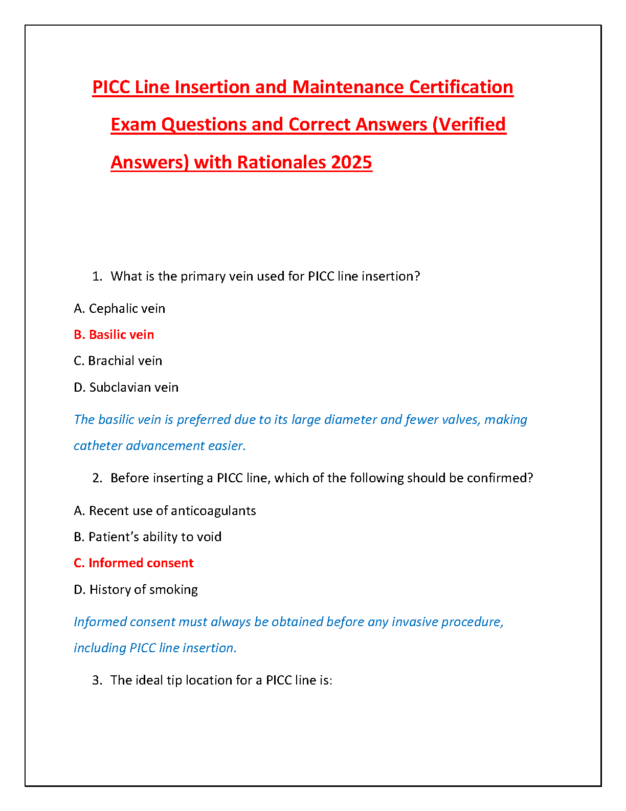 PICC Line Insertion and Maintenance Certification Test Bank 2025/2026: Verified Exam Questions and Answers with Rationales to Guarantee a First-Try Pass