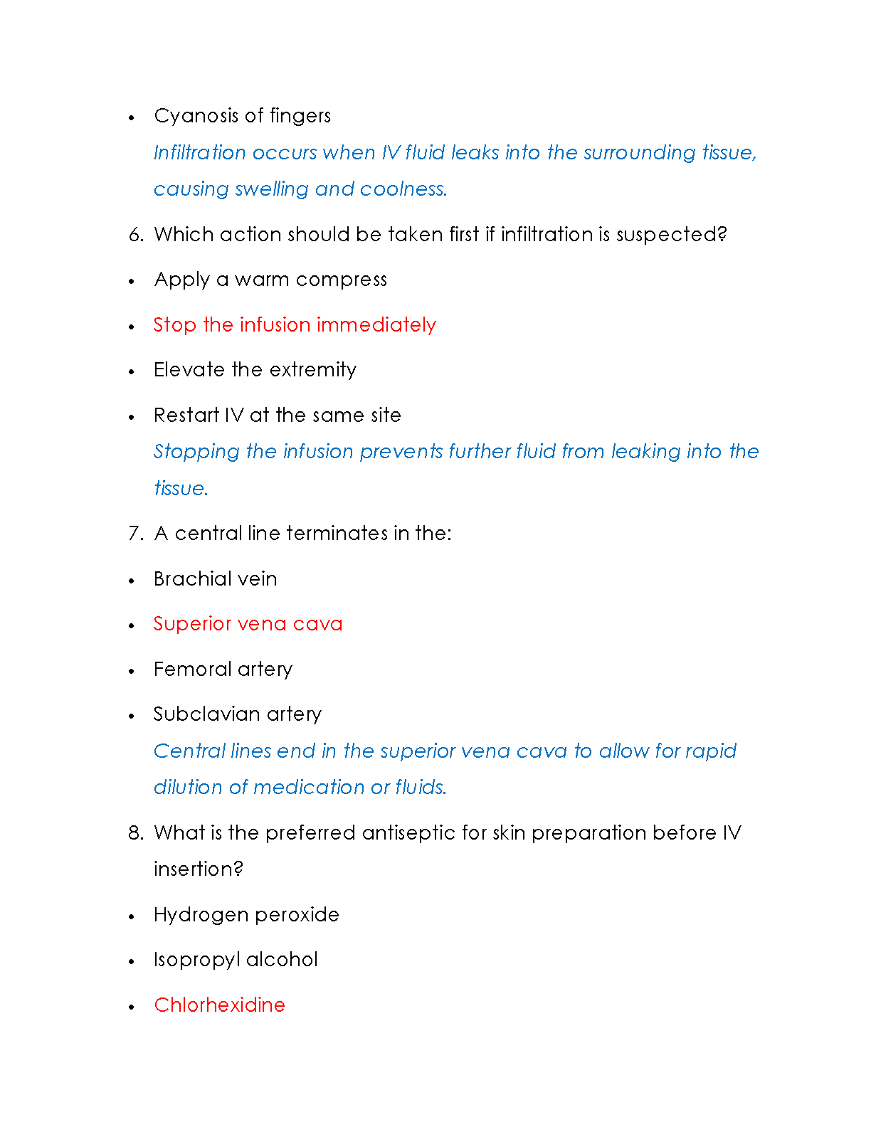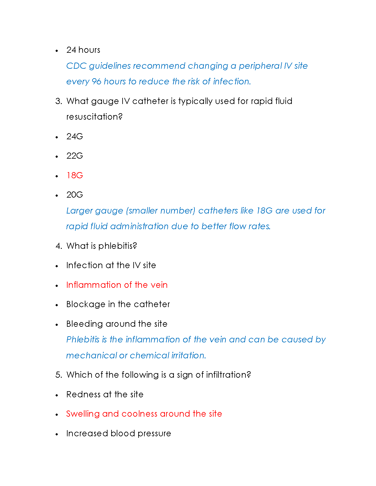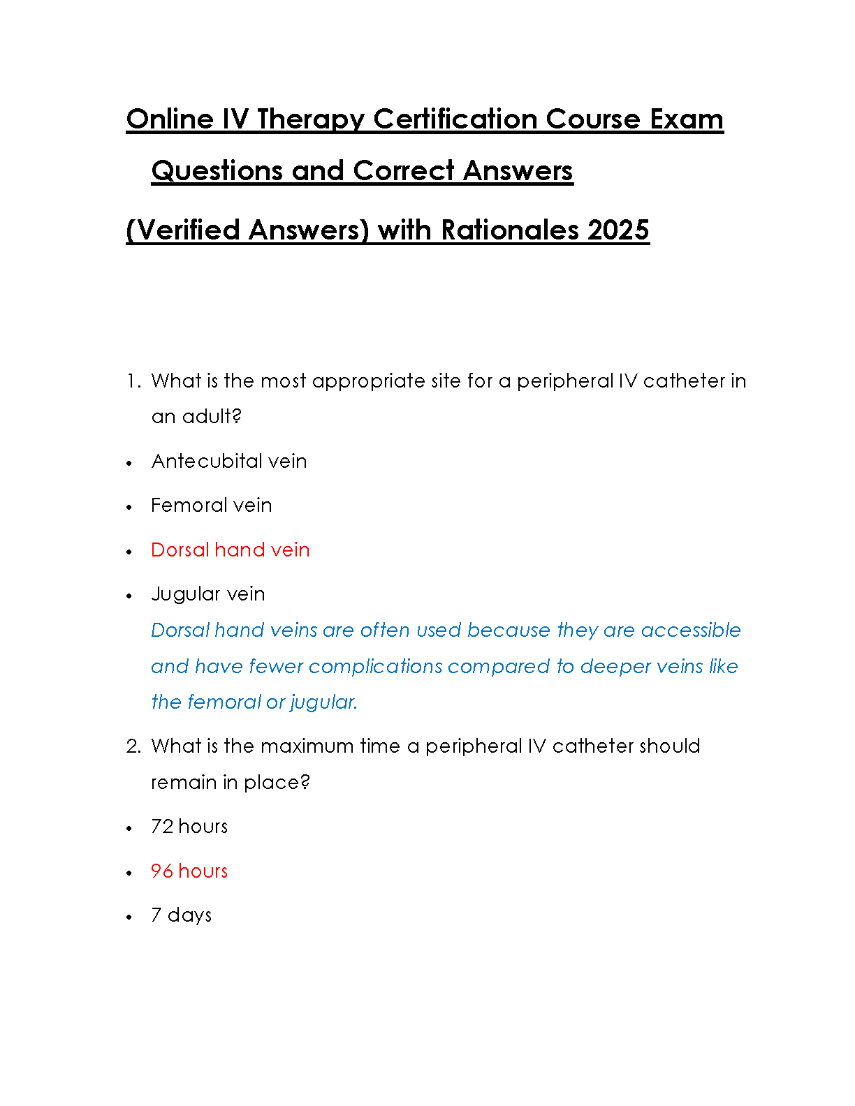 Ace your Online IV Therapy Certification Course Exam with our comprehensive test bank, fully updated for the 2025-2026 academic year. This essential study guide features a complete collection of exam questions paired with verified, correct answers and in-depth rationales. It is expertly designed to help nursing students and healthcare professionals master key concepts such as appropriate IV sites, catheter duration, and other critical procedures. Prepare effectively, build your confidence, and ensure you pass your certification exam on the very first attempt, avoiding costly resits. This resource is your ultimate tool for success in IV therapy.