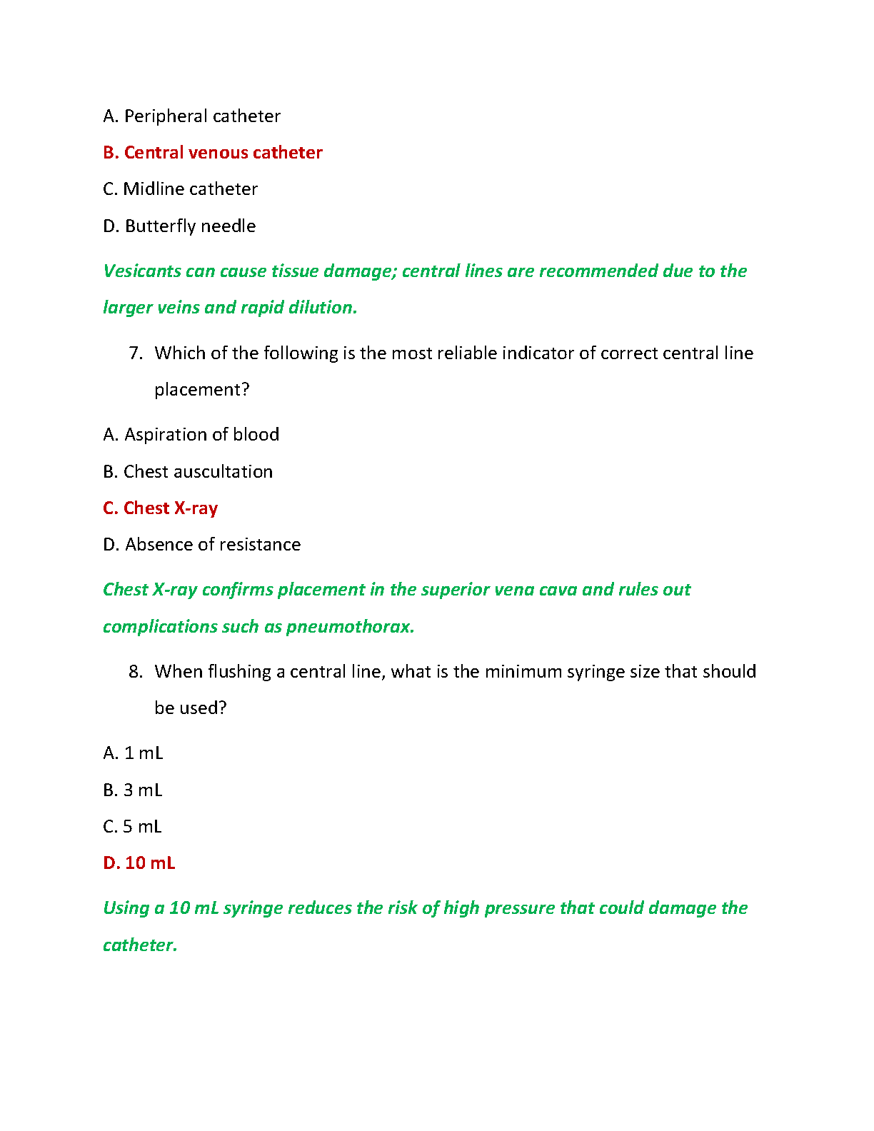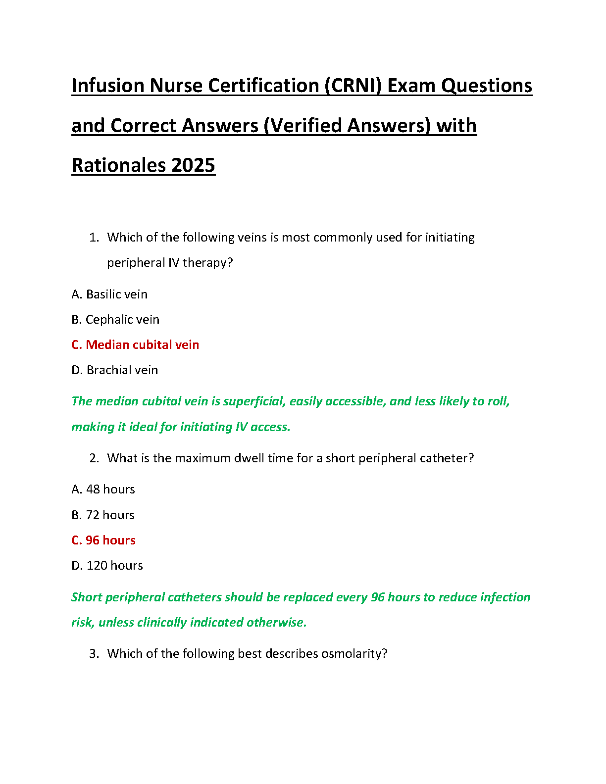 Ace your Infusion Nurse Certification exam with our comprehensive CRNI Exam Test Bank for 2025. This essential study resource provides a wide array of practice questions, each accompanied by verified correct answers and in-depth rationales. Master key concepts in infusion therapy, from selecting appropriate veins like the median cubital to understanding catheter dwell times and osmolarity. Our test bank is designed to simulate the real exam environment, boosting your confidence and ensuring you are fully prepared to pass on your first attempt. Get immediate access to this top-rated guide and take the next step in your nursing career.