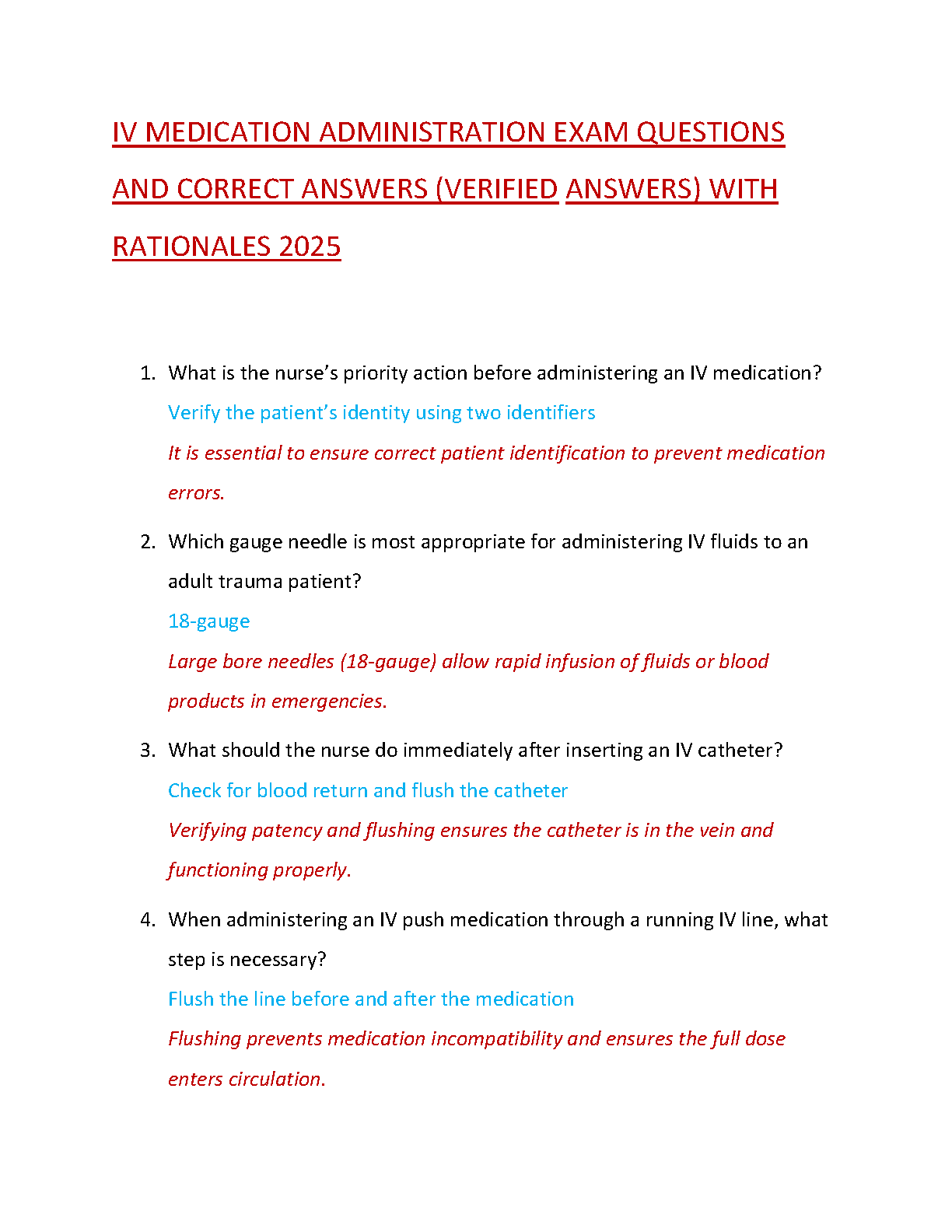 Ace your nursing exams with our latest 2025/2026 study guide for IV Medication Administration. This comprehensive test bank features a curated set of exam-style questions, each paired with a verified correct answer and a detailed rationale to ensure you fully understand the concepts. Covering crucial topics like patient identification, needle selection, and flushing protocols, this guide is expertly designed to help you master the material, pass your exams on the first try, and avoid costly resits. Build your clinical confidence and secure your success!