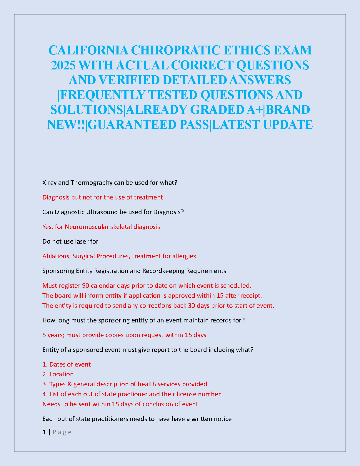 Ace your California Chiropractic Ethics Exam with our comprehensive and up-to-date test bank for the 2025-2026 academic year. This meticulously prepared study guide features a complete collection of frequently tested questions, each paired with a verified, detailed answer. Our content is already graded A+, ensuring you study only the most accurate and relevant material. Designed to help you pass on your very first attempt, this resource covers all critical topics you'll encounter on the real exam. Say goodbye to exam anxiety and the possibility of resits. Our solutions are clear, concise, and easy to understand, making your preparation efficient and effective. Secure your success and take the next step in your chiropractic career with confidence!