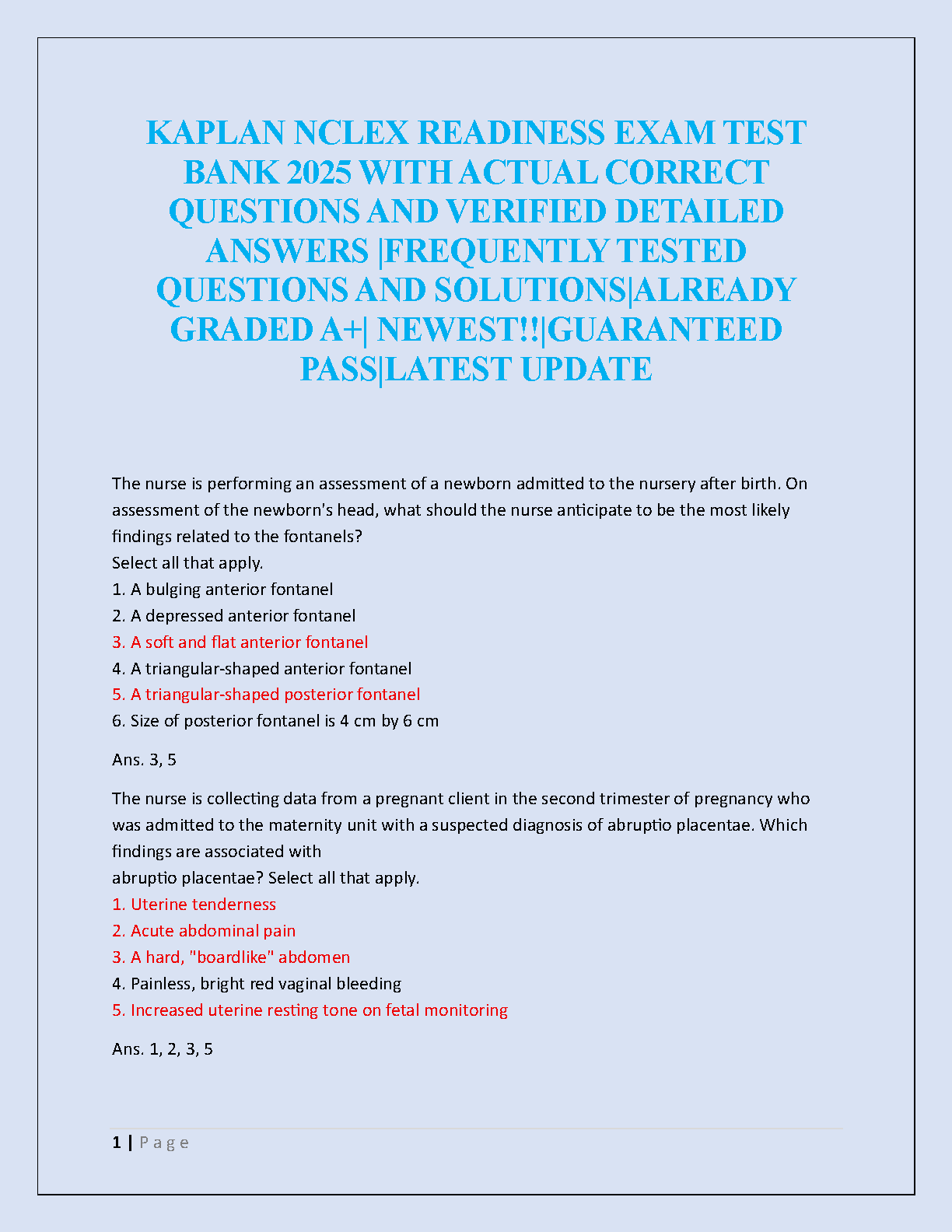 Kaplan Nursing NCLEX Readiness Exam 2025 Test Bank: Verified Questions & A+ Graded Answers