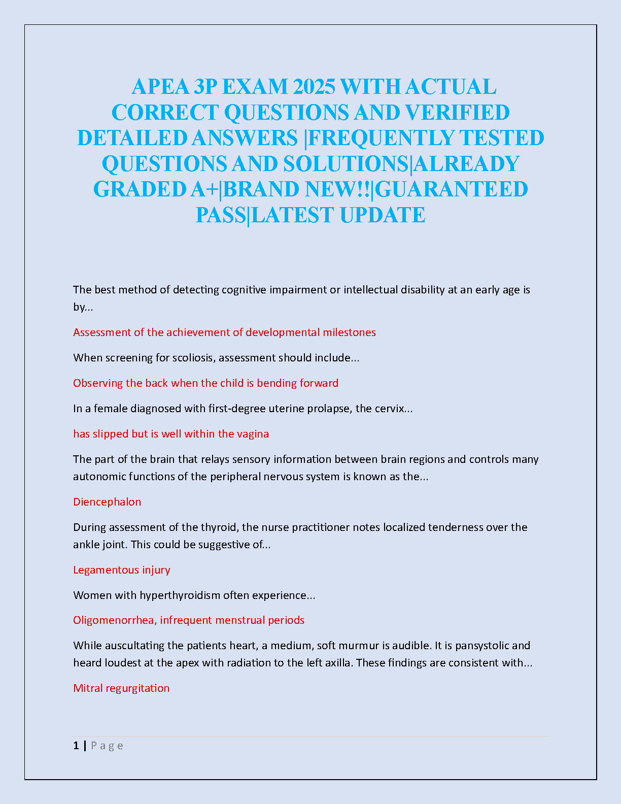 Ace your APEA 3P certification exam with confidence! This comprehensive test bank for the 2025/2026 academic year is your key to success. It features a collection of actual, frequently tested questions complete with verified, detailed answers and solutions. Designed to help you master the core concepts of Advanced Pharmacology, Pathophysiology, and Physical/Health Assessment, this study guide is already graded A+ and guarantees you pass on your first attempt. Stop worrying about resits and start preparing with the latest, most reliable resource available.