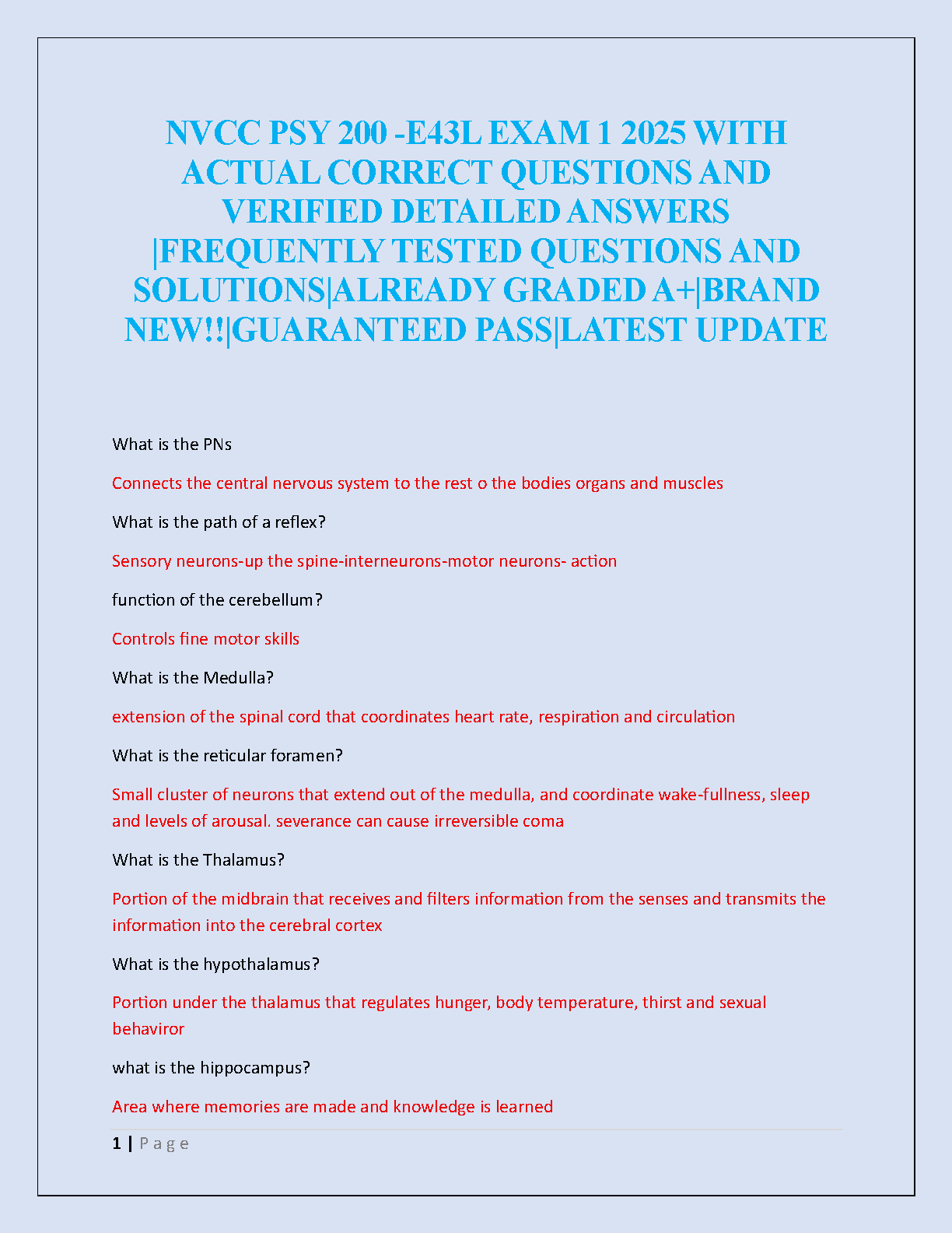 Ace your NVCC PSY 200 Exam 1 with our comprehensive test bank, updated for the 2025 academic year. This essential study resource provides a complete set of actual exam questions accompanied by verified, detailed answers. Covering key topics such as the nervous system, brain functions (cerebellum, medulla, thalamus), and the reflex arc, this guide is designed to help you master the material. With frequently tested questions and A+ graded solutions, you'll have everything you need to study effectively and pass your exam with confidence on the first try. Get the brand new, latest update and secure your A!