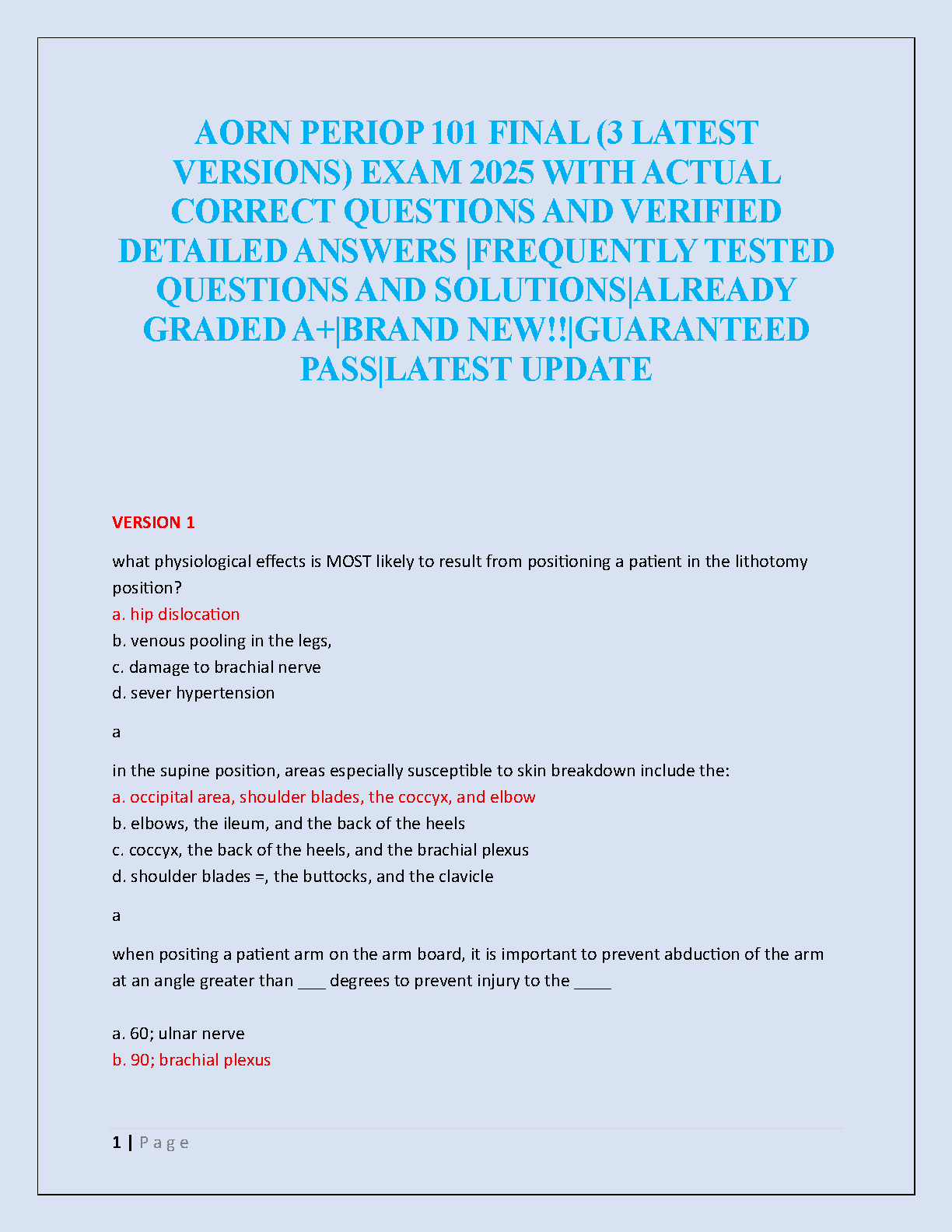 Ace your AORN Periop 101 Final Exam with this comprehensive test bank for the 2025 academic year. This brand-new resource includes three of the latest versions of the exam, packed with actual questions and verified, detailed answers. Each version has been meticulously compiled and is already graded A+, ensuring you study the most relevant and frequently tested material. Prepare confidently and guarantee your pass on the first try with this essential study guide.
