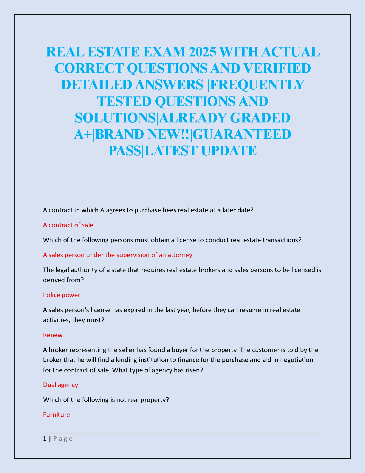 Ace your Real Estate Exam on the first try with our latest 2025-2026 Test Bank! This comprehensive study guide is meticulously crafted to help you succeed, featuring a collection of frequently tested questions with verified, 100% correct answers and detailed solutions. Each question is designed to mirror the actual exam, ensuring you are fully prepared for every topic. Say goodbye to exam anxiety and avoid costly resits. With this A+ graded resource, you're not just studying; you're guaranteeing your pass and stepping confidently into your real estate career.