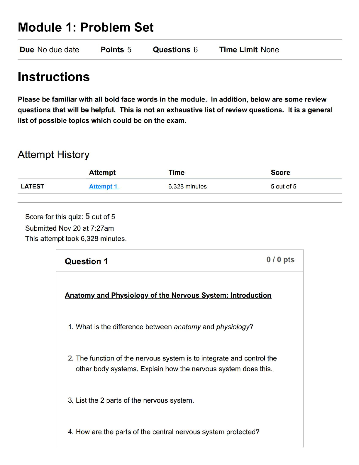 Master the fundamentals of the nervous system with our meticulously solved Module 1 Problem Set for Anatomy and Physiology, inspired by Kenneth Saladin's 10th Edition. Achieve a perfect 5/5 score by understanding detailed answers to key introductory questions covering the distinction between anatomy and physiology, the integrative functions of the nervous system, its major divisions, and protective structures. This study guide is your essential tool for acing your exam and building a strong foundation in A&P.