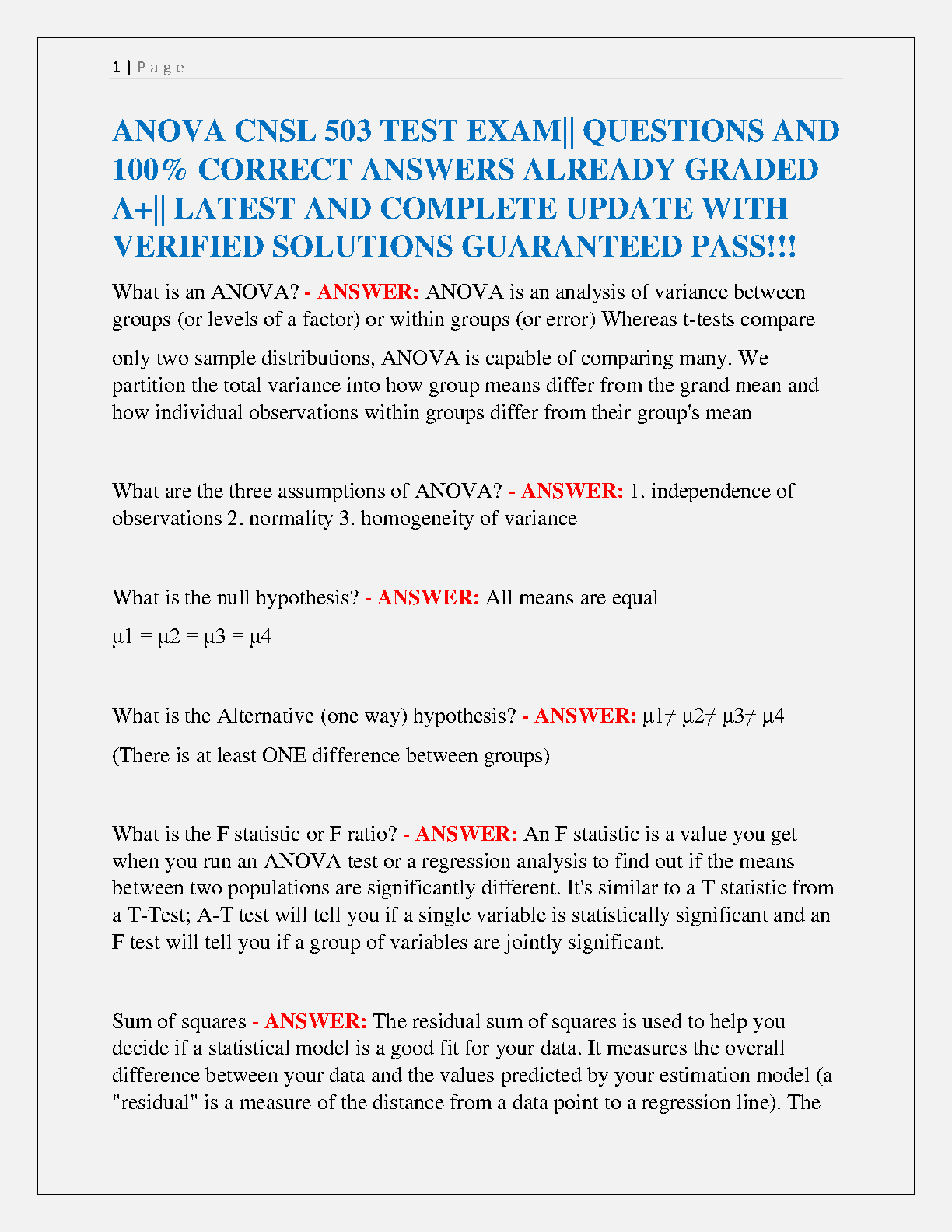 Get the ultimate study resource for CNSL 503 Research and Program Evaluation. This comprehensive test bank focuses specifically on the ANOVA (Analysis of Variance) section of your exam. It features a complete set of questions with 100% correct, verified answers, already graded A+. Master key concepts such as the three assumptions of ANOVA, null vs. alternative hypotheses, F-statistic, and sum of squares. This is the perfect tool to help you ace your exam, understand complex statistical concepts, and achieve a top grade. Download now and prepare to pass with confidence!