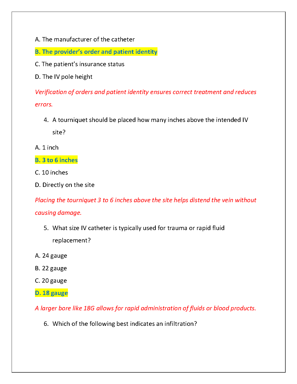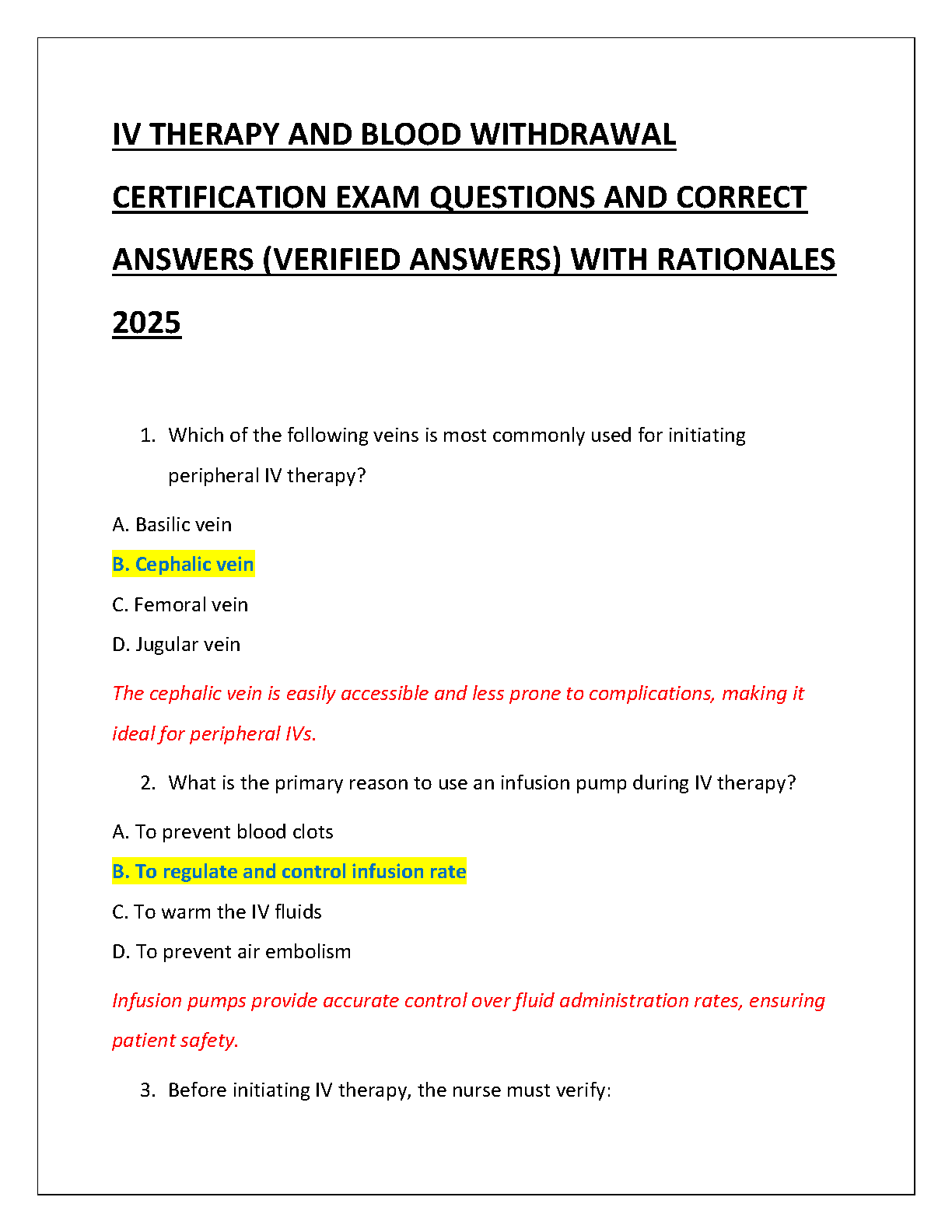 Get ready to ace your IV Therapy and Blood Withdrawal Certification Exam with our comprehensive 2025 Test Bank. This essential study guide is packed with practice questions, verified correct answers, and in-depth rationales to ensure you have a complete understanding of the material. Each rationale explains the 'why' behind the answer, solidifying your knowledge and boosting your confidence. Designed for the 2025/2026 academic year, this resource is your key to passing the exam on your first attempt and avoiding costly resits. Prepare effectively, learn efficiently, and take the next step in your nursing career.